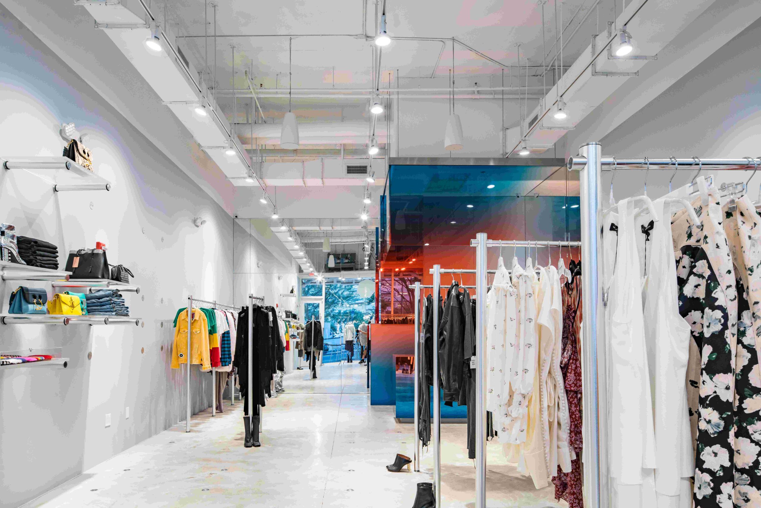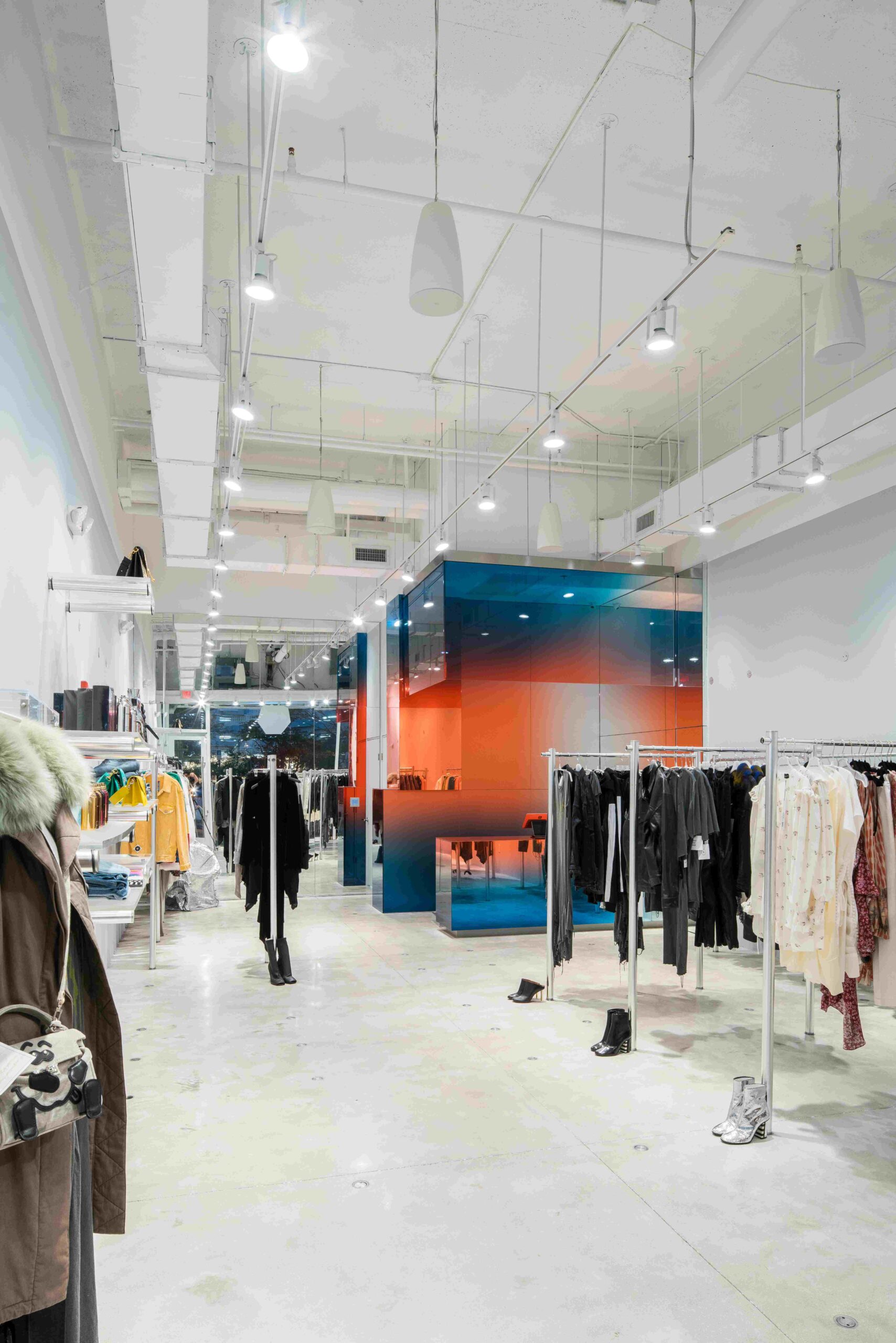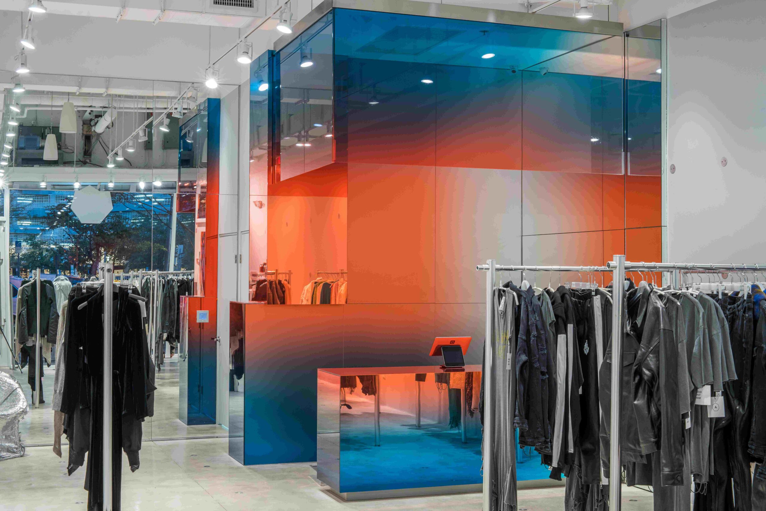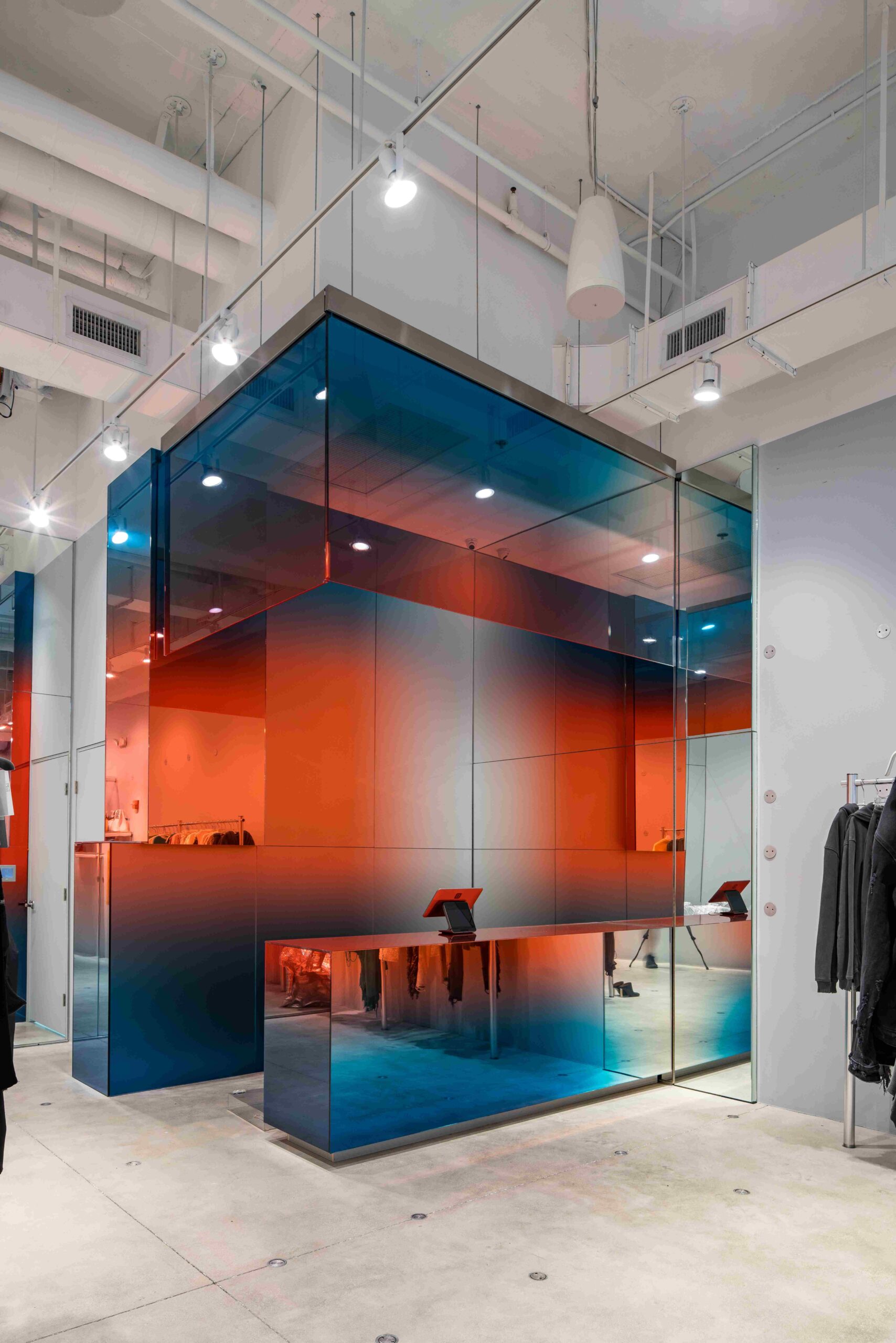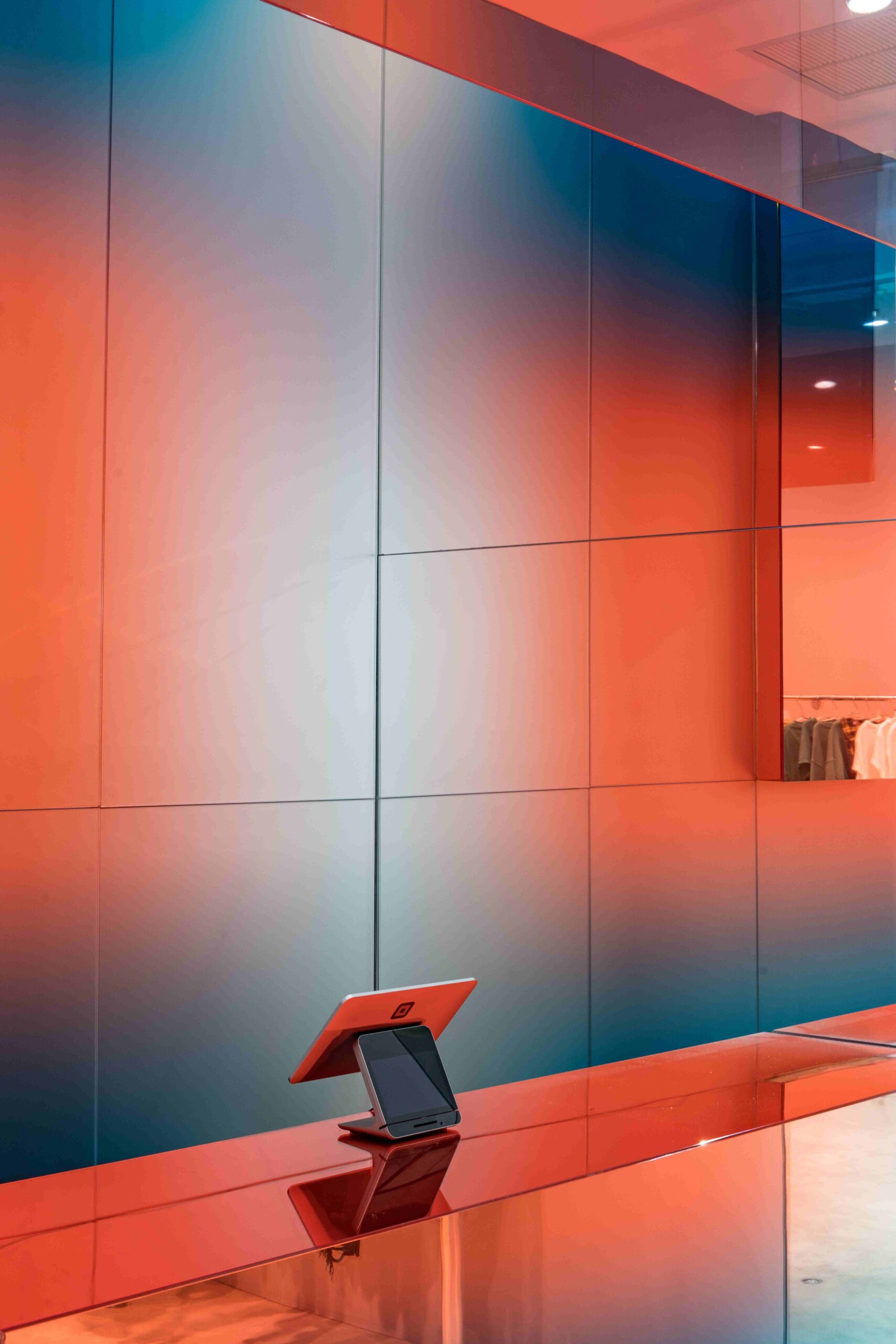 The fourth RGA-designed concept store for Alchemist is a reflection of the long-term collaboration between the firm and brand. Owners Roma and Erika Cohen conceived this minimalist store to adapt to a new retail landscape, which will feature a constantly changing selection of fashion, beauty, and lifestyle items. While most of the materials evoke the minimalist ideal of a more focused, back to basics ideology with raw concrete floors and custom steel clothing racks; they also provide a clean canvas for a spatially complex colored mirrored installation which is a collaboration between industrial designer Germans Ermičs and RGA. These colored mirrored panels in the back of the store expand the store and create the illusion of having significantly more space than actually present. These various finishes of colored mirrors and glass reflect, filter, and saturate the space. “Tangerine Haze” was selected from a color palette developed as a larger collaborative series of colorways developed by González and Ermičs and inspired by the unique Miami sea and sky.