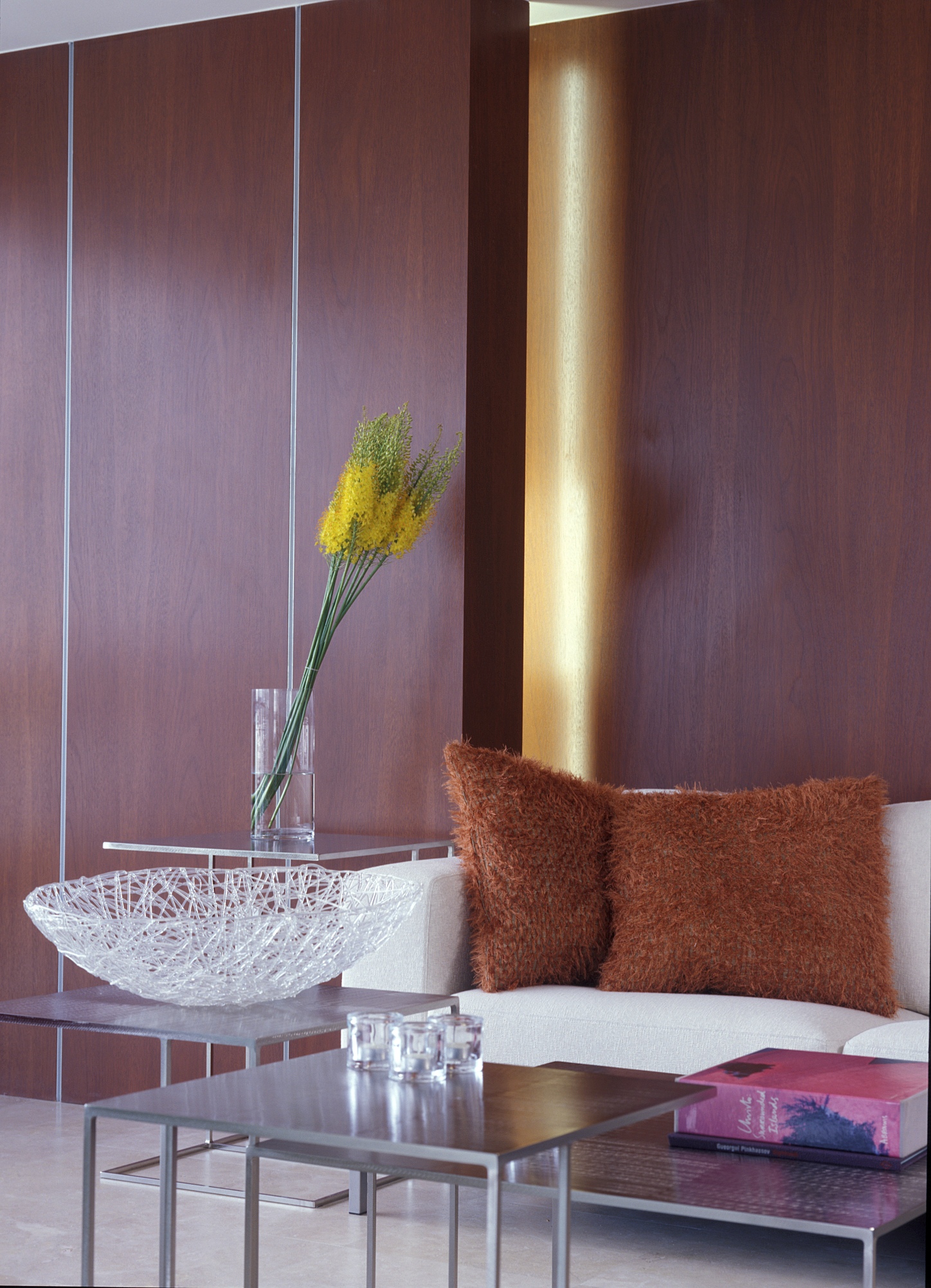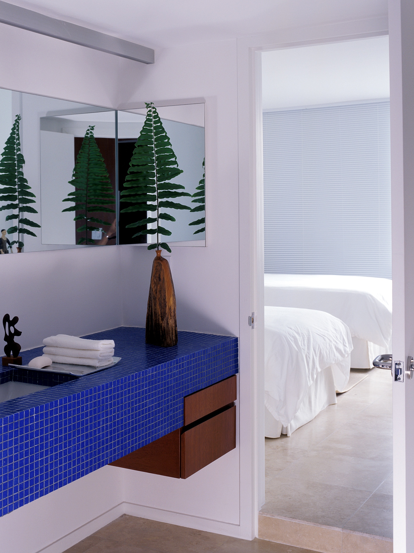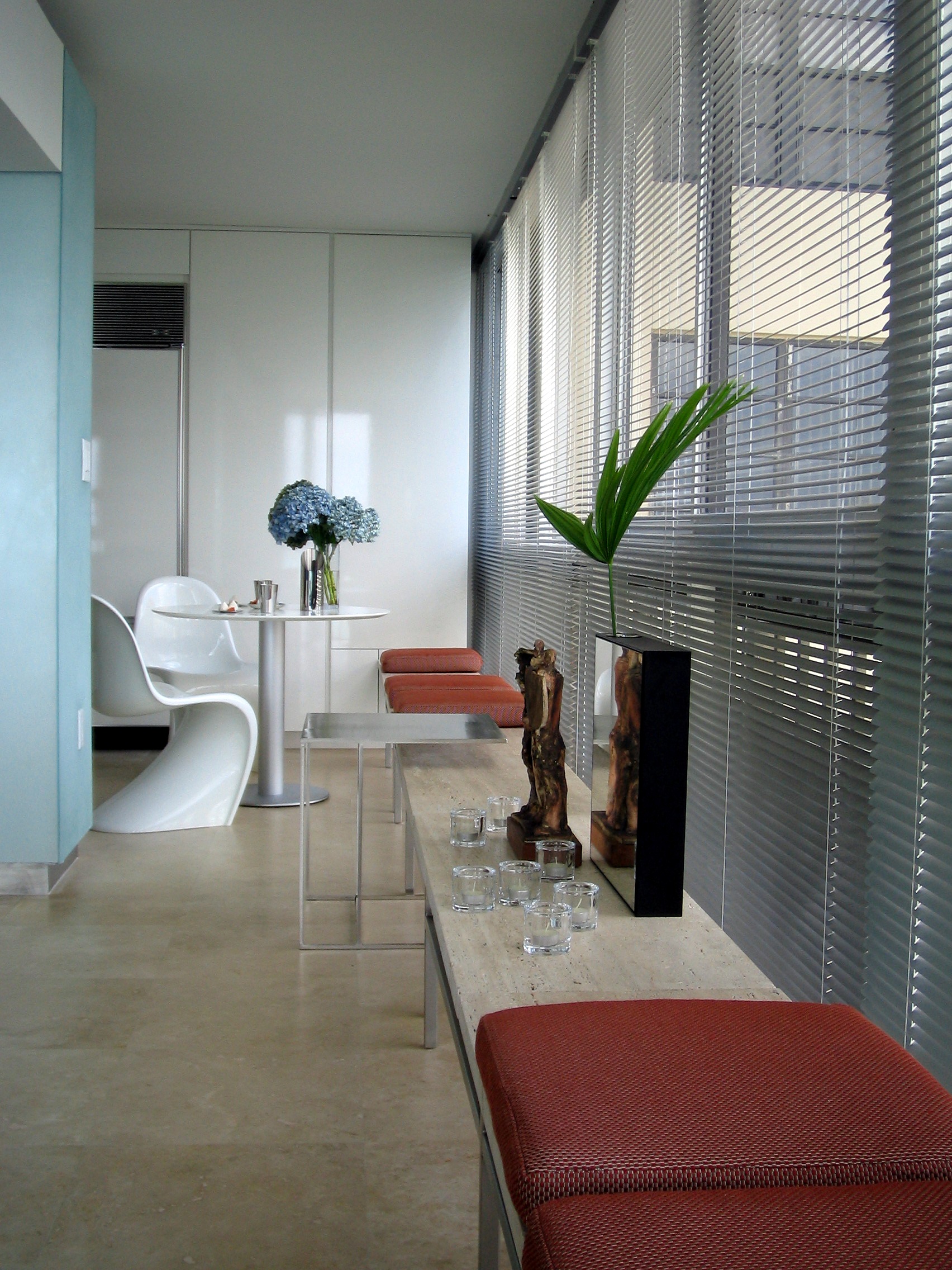 The Brickell Bay Club apartment has panoramic bay and city views of Key Biscayne and downtown Miami. These magnificent views are the stimulus for creating an open space that is oriented towards the water and sky.