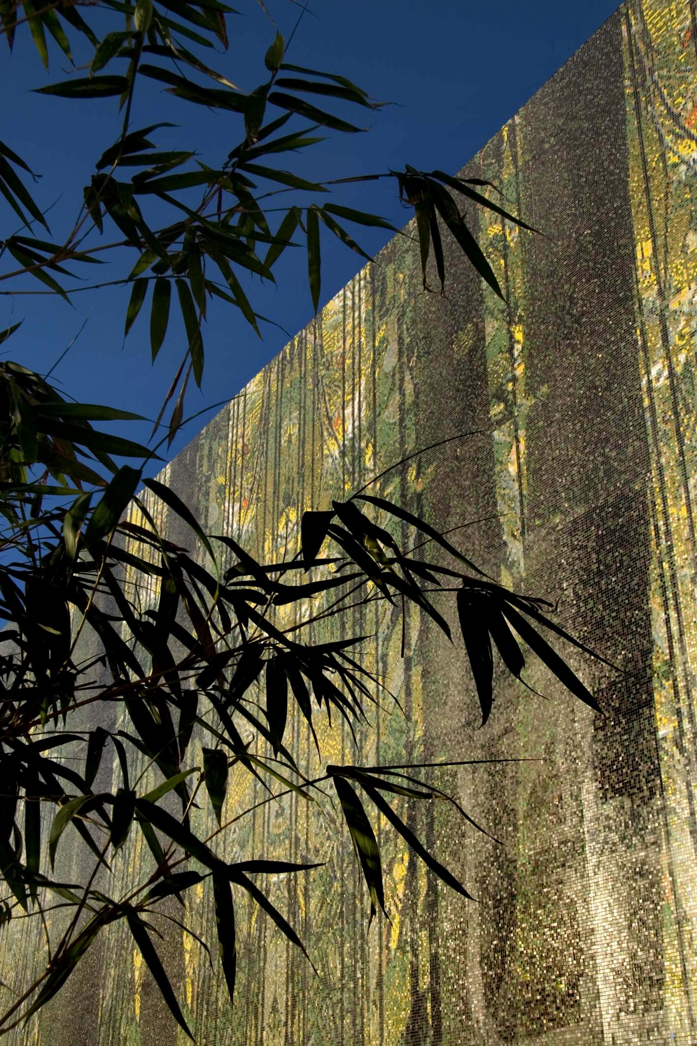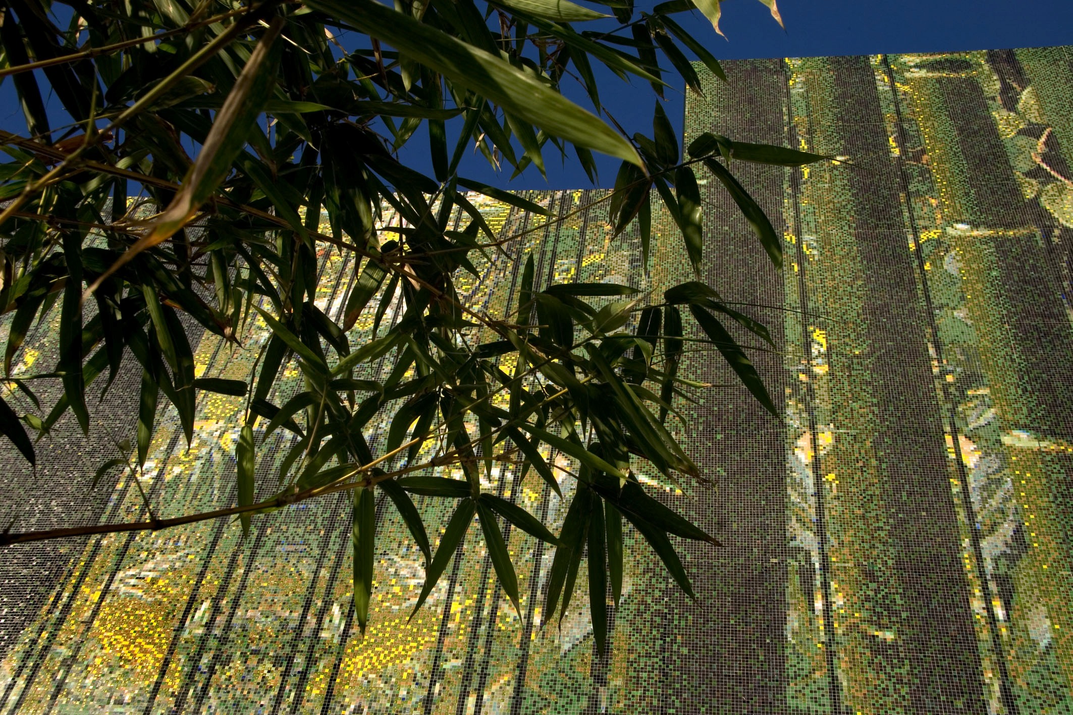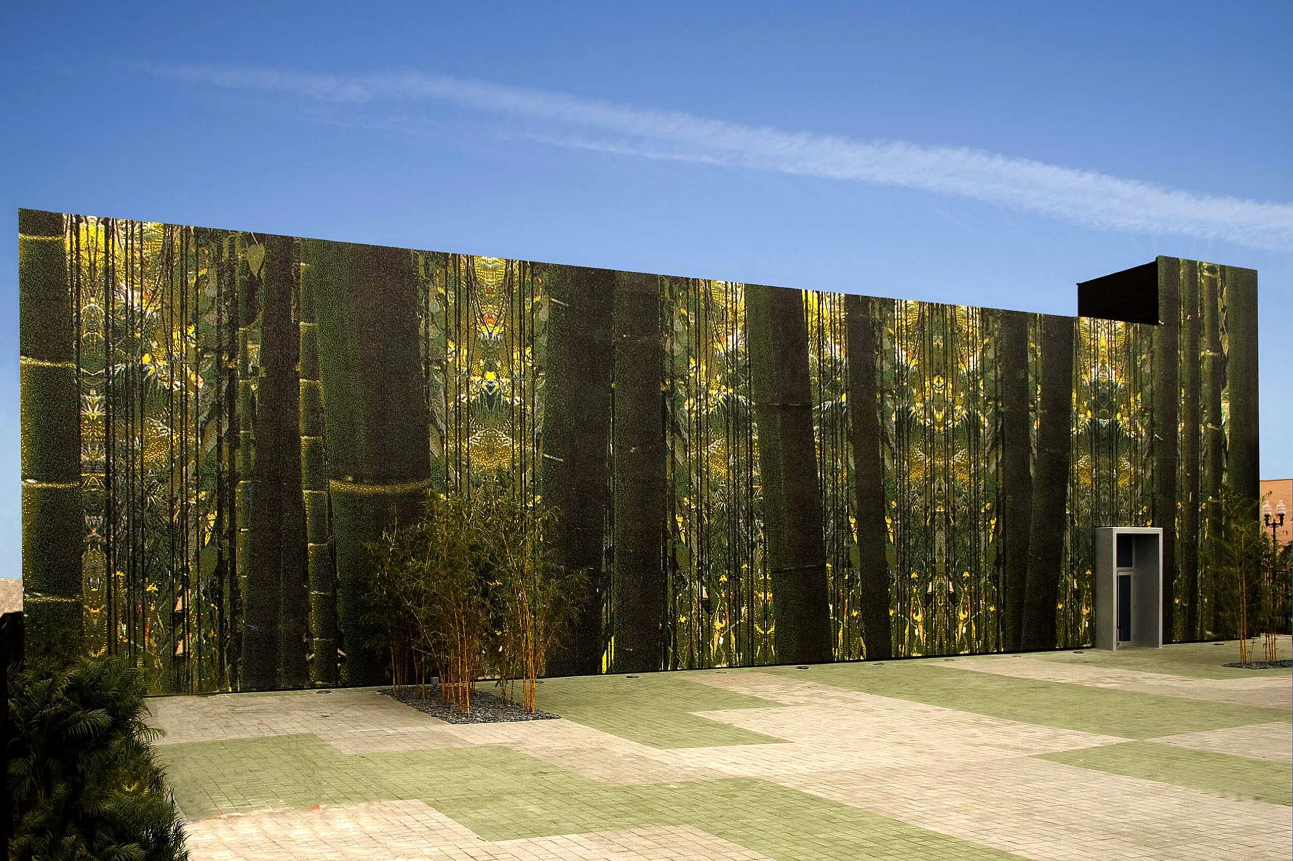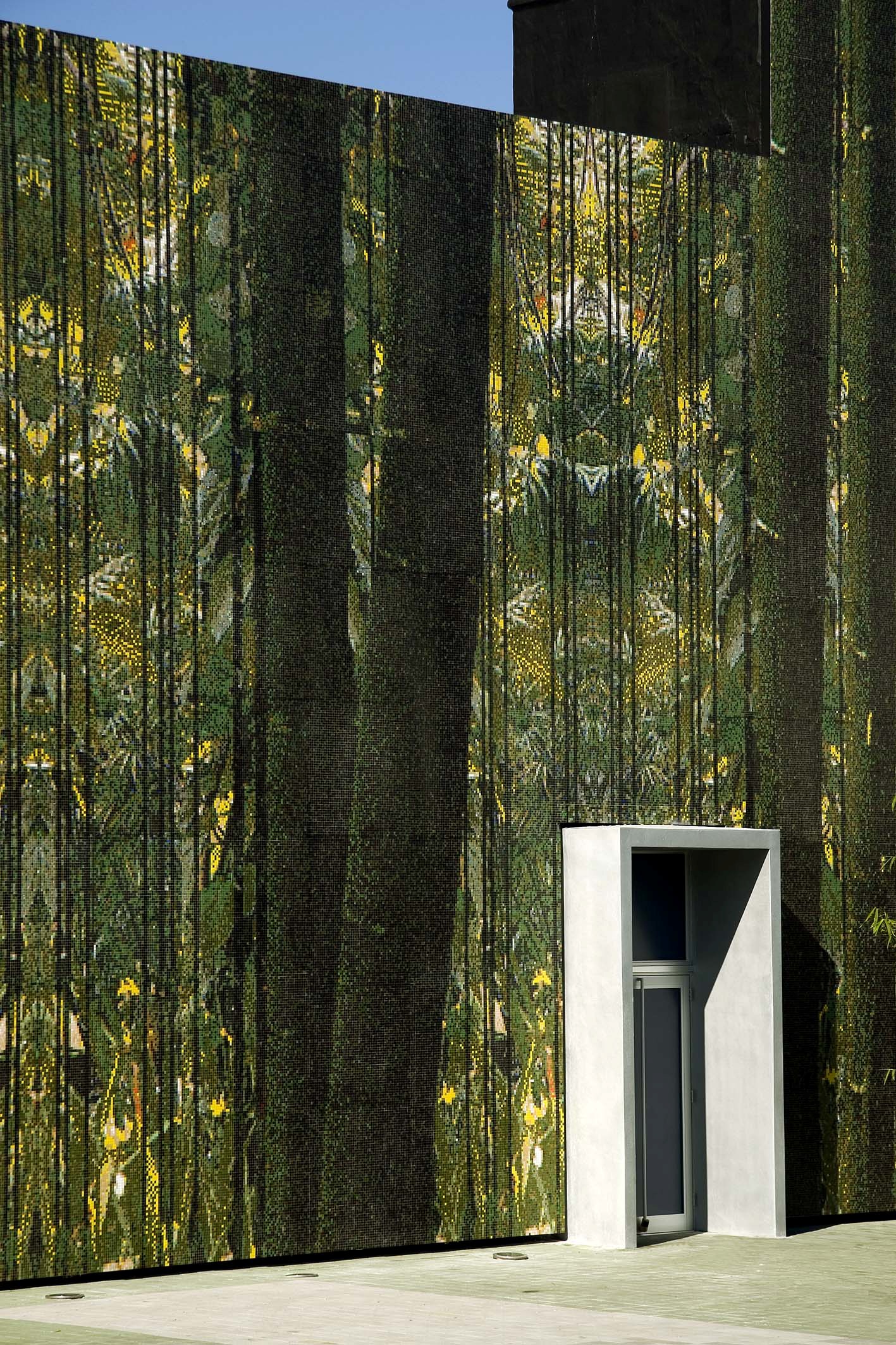 The façade, which is composed of over one million Bisazza glass mosaic tiles, allows the museum to be perceived as a large jungle landscape at the urban scale. At the human scale, the tiles allow one to perceive different organic spatial conditions, colors, and patterns depending on the vantage point. It shifts and changes as the viewers adjust their focus. The natural patterns on the façade are folded onto the ground in the plaza infusing the ground plane with similar patterns. The installation of bamboo and weeping ficus gardens challenges notions of perception as well as heightens the sensation of being in a jungle.