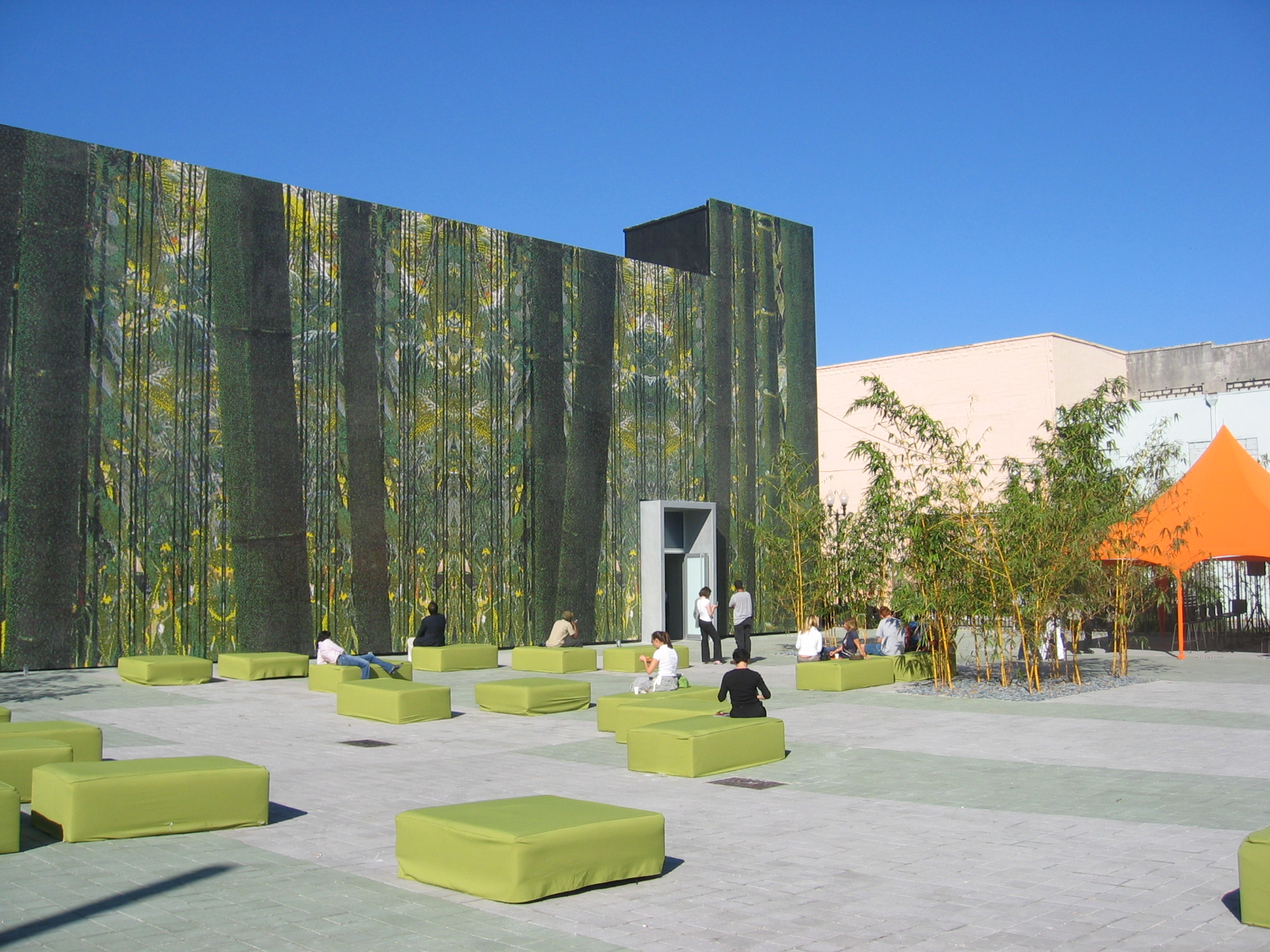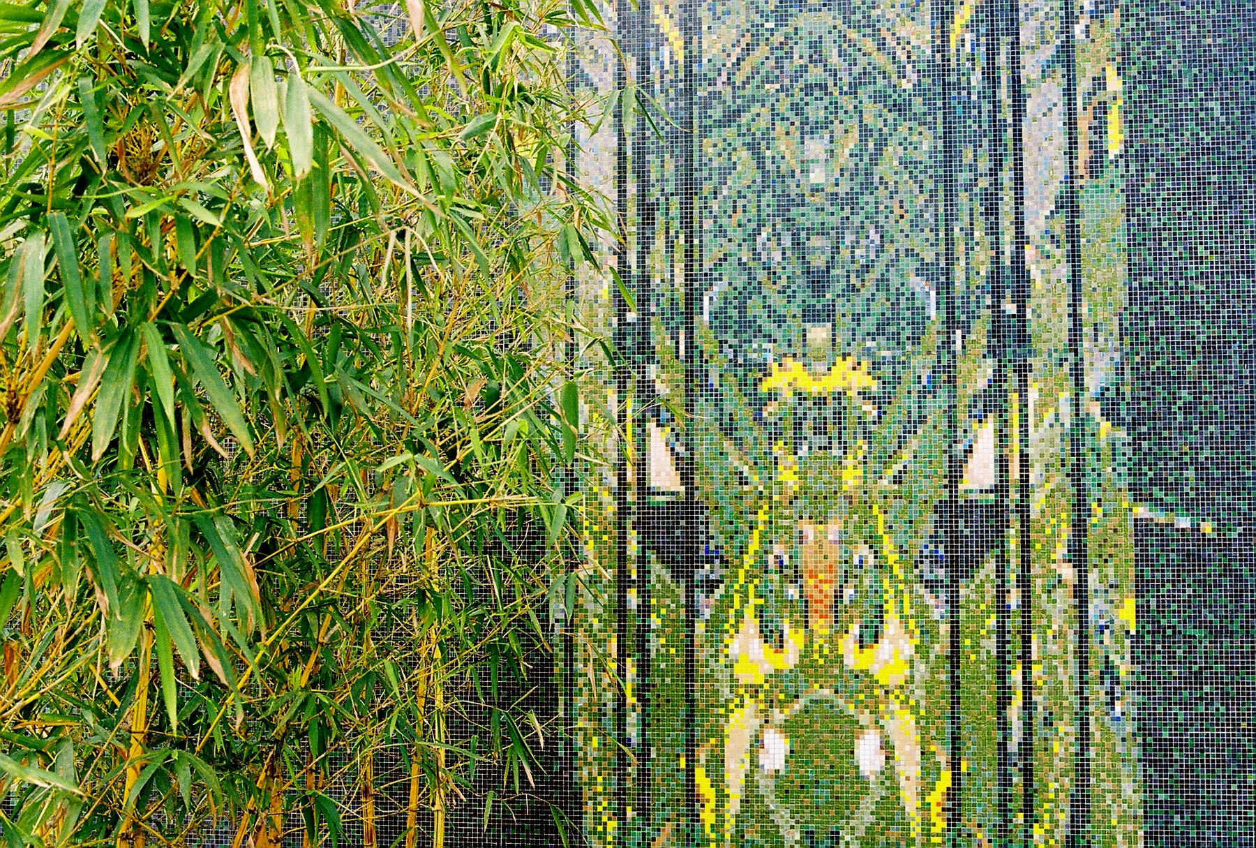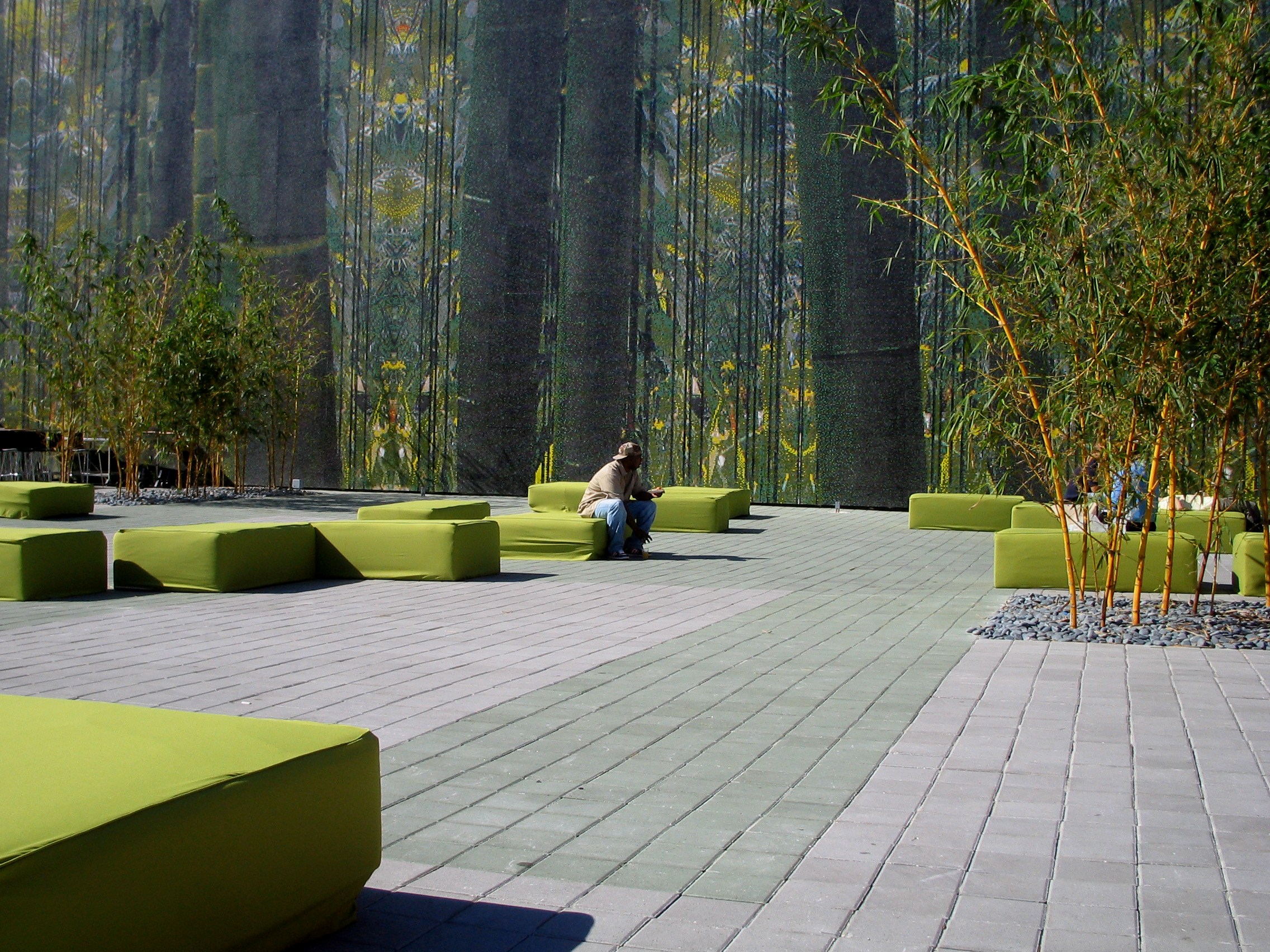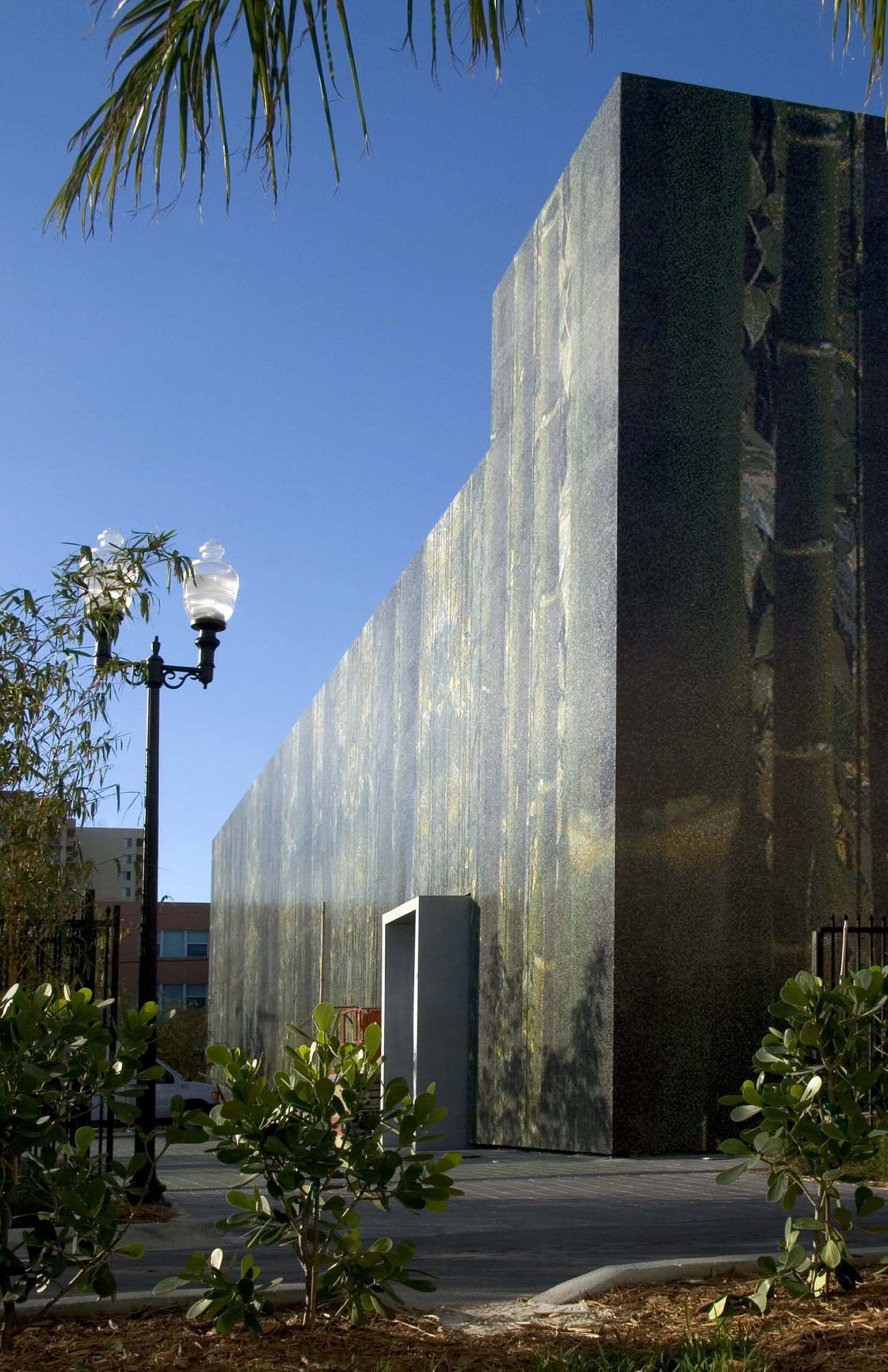 The façade, which is composed of over one million Bisazza glass mosaic tiles, allows the museum to be perceived as a large jungle landscape at the urban scale. At the human scale, the tiles allow one to perceive different organic spatial conditions, colors, and patterns depending on the vantage point. It shifts and changes as the viewers adjust their focus. The natural patterns on the façade are folded onto the ground in the plaza infusing the ground plane with similar patterns. The installation of bamboo and weeping ficus gardens challenges notions of perception as well as heightens the sensation of being in a jungle.