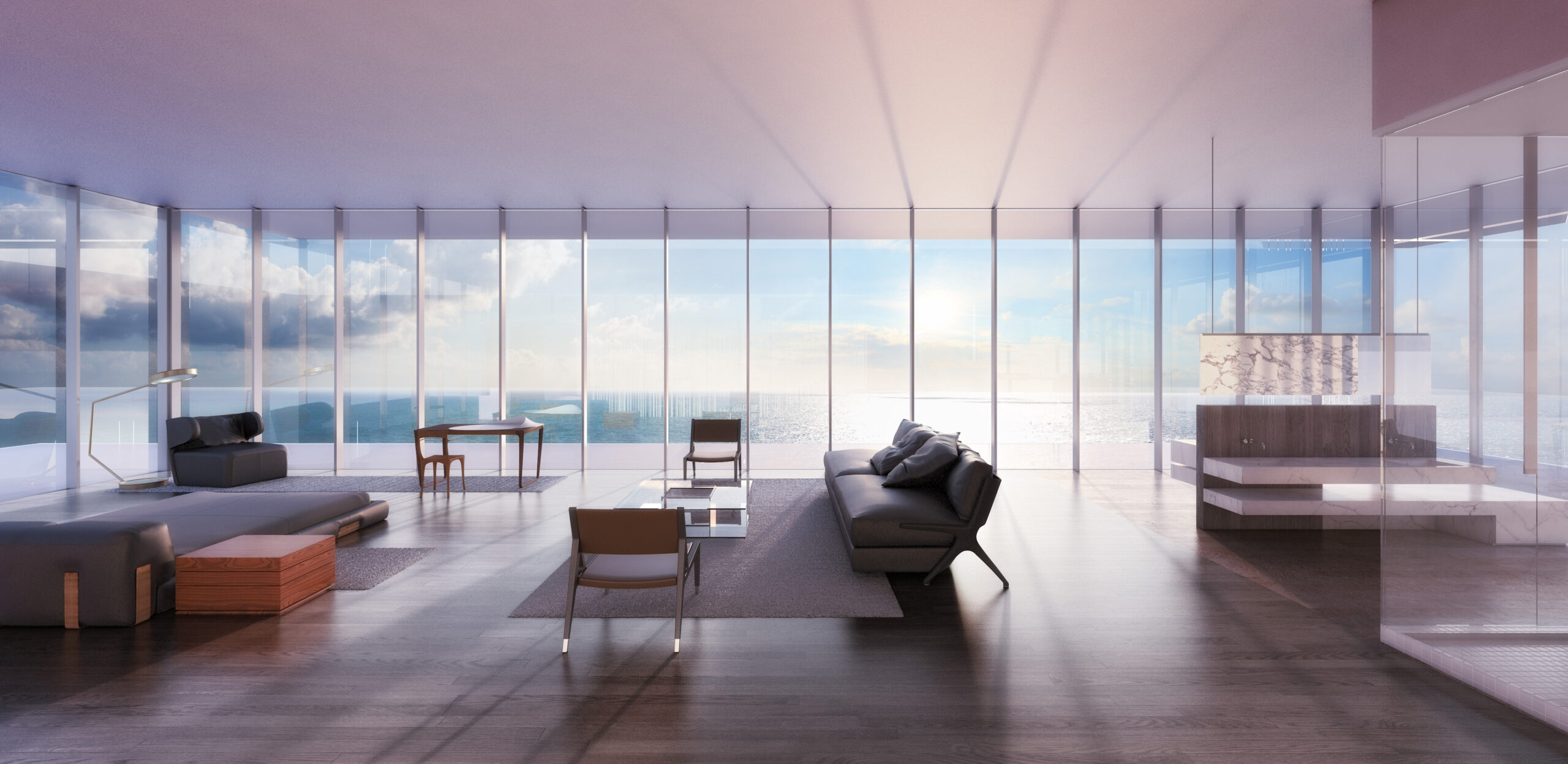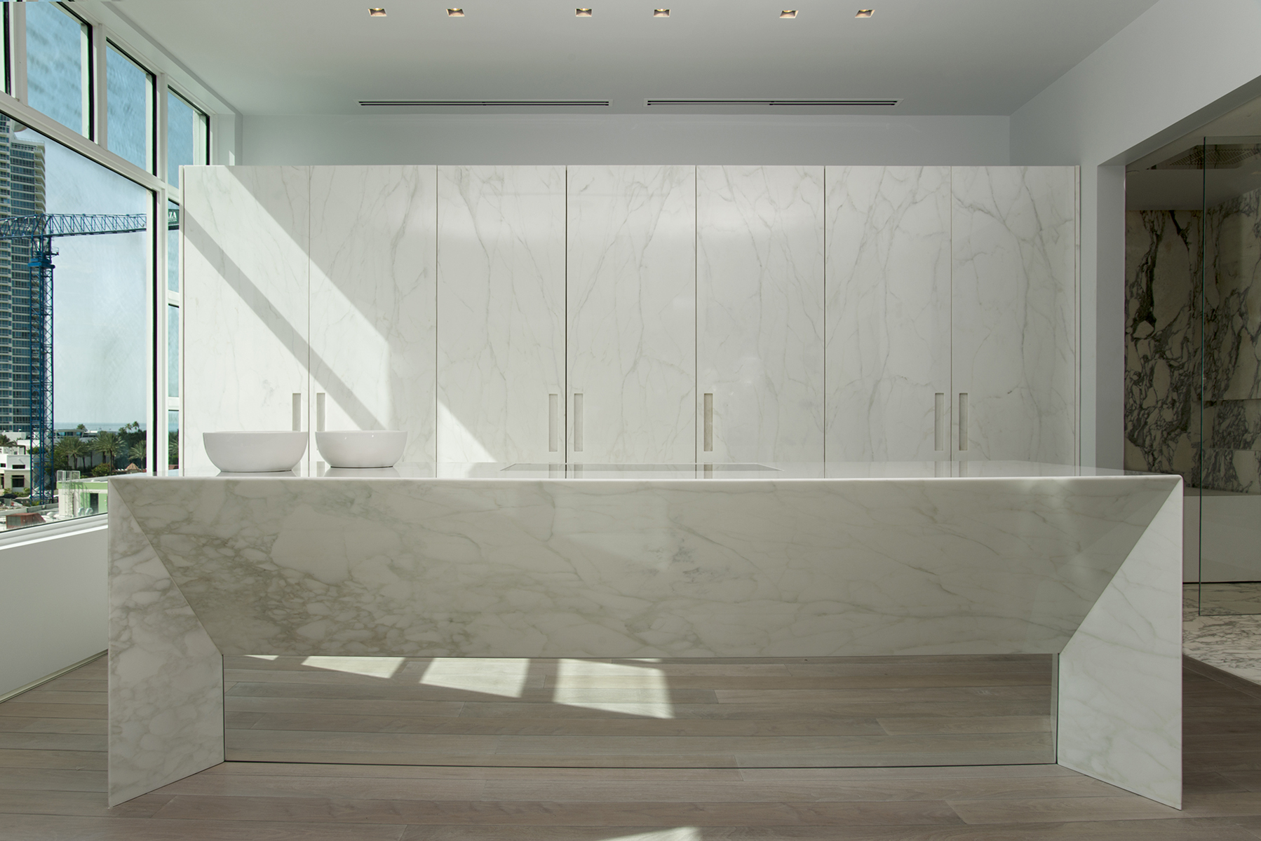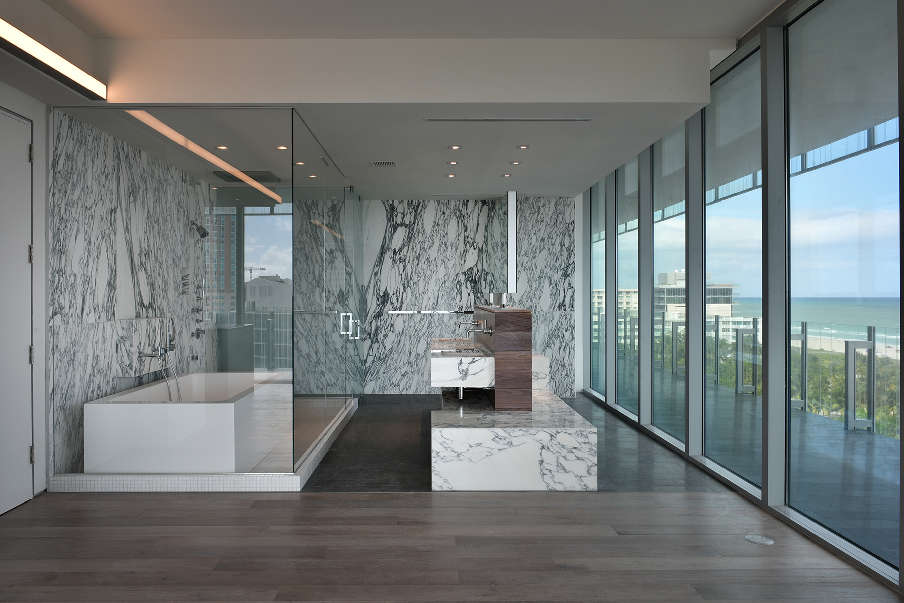The tower itself conveys the qualities of the sky. Open floor plans with 360-degree views and expansive terraces with sliding doors blur the boundaries between indoor and outdoor space. Mirrored walls at every entry reflect an expansive view of the ocean. Indicating the shift between night and day, each foyer also contains a custom ceiling combining a translucent latex surface and a programmable lighting system choreographed to evoke the star-lit canopy of both urban and rural skies. Delicate and sensorial, the design of GLASS is a considered response to its setting in Miami Beach, specifically intended to allow one to experience the surrounding natural landscape.