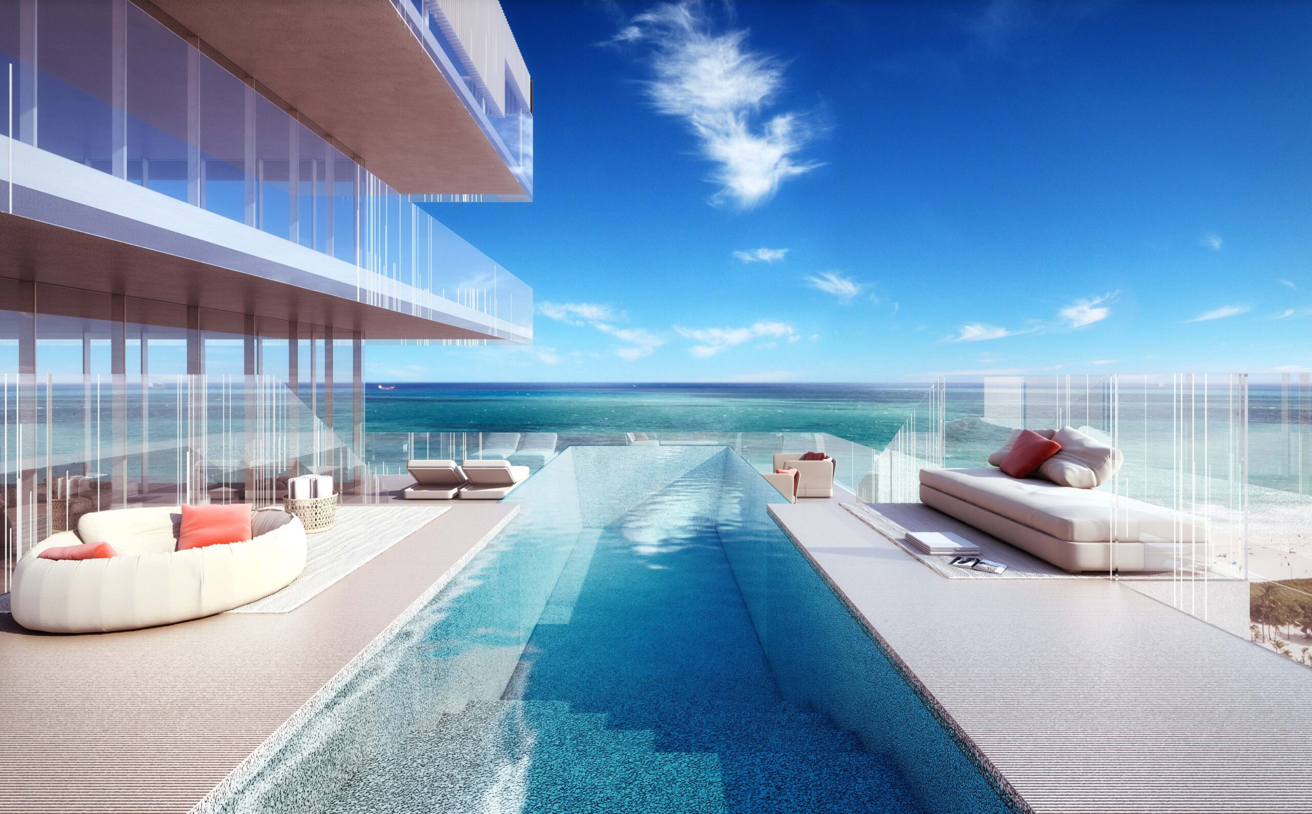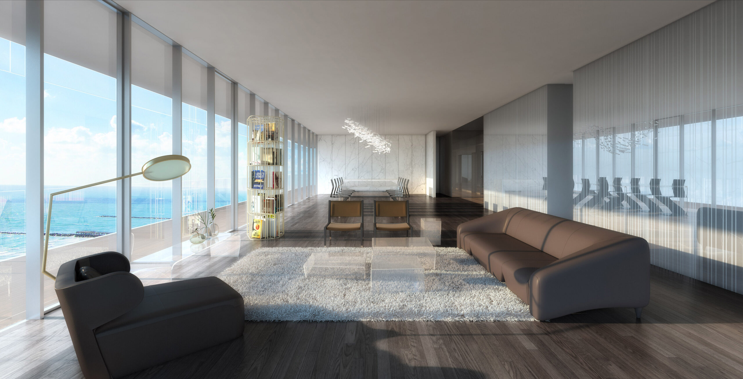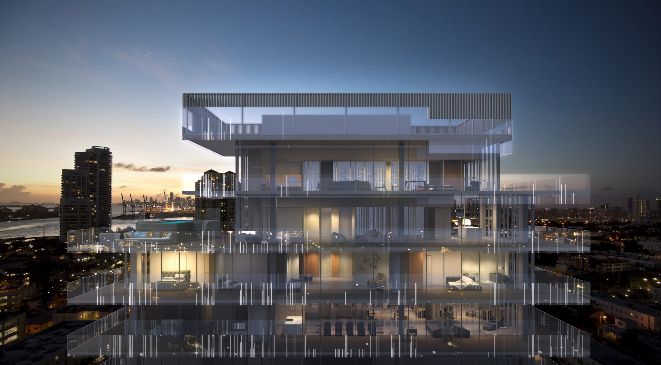 The tower itself conveys the qualities of the sky. Open floor plans with 360-degree views and expansive terraces with sliding doors blur the boundaries between indoor and outdoor space. Mirrored walls at every entry reflect an expansive view of the ocean. Indicating the shift between night and day, each foyer also contains a custom ceiling combining a translucent latex surface and a programmable lighting system choreographed to evoke the star-lit canopy of both urban and rural skies. Delicate and sensorial, the design of GLASS is a considered response to its setting in Miami Beach, specifically intended to allow one to experience the surrounding natural landscape.