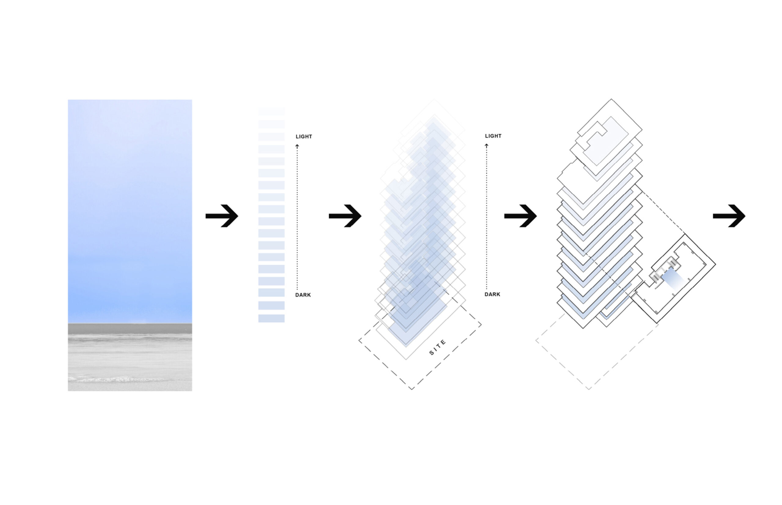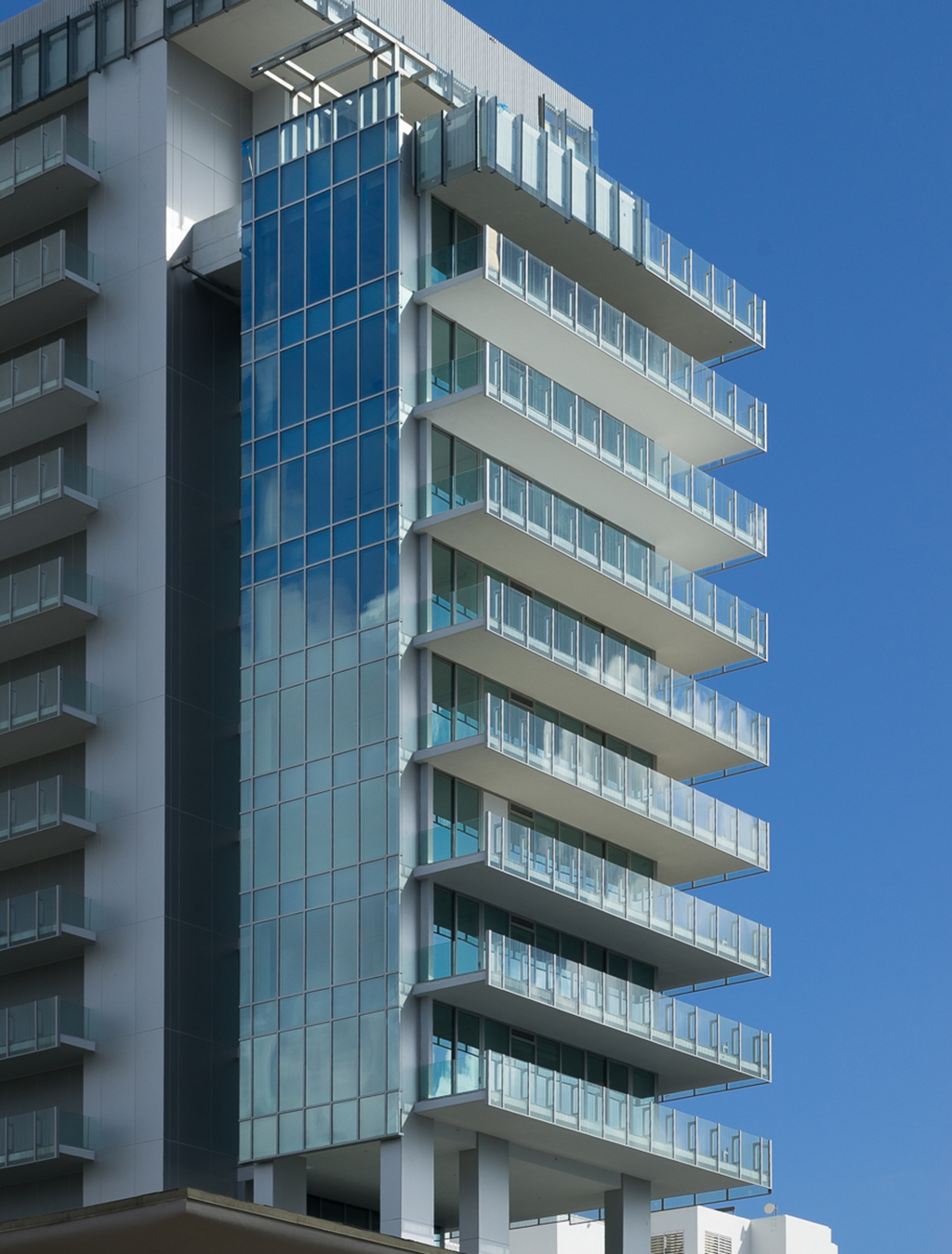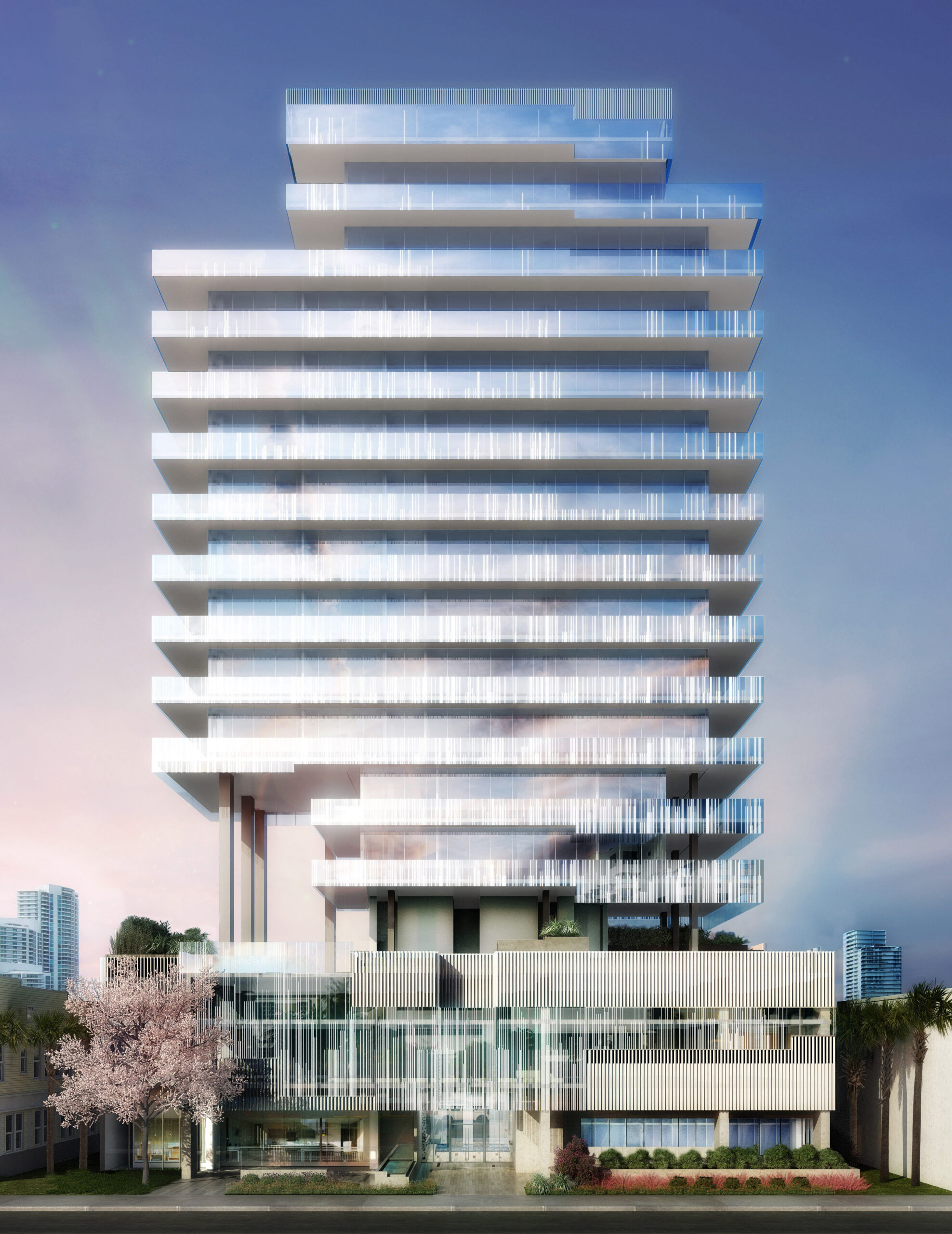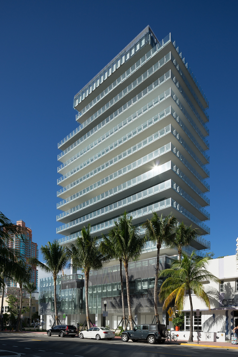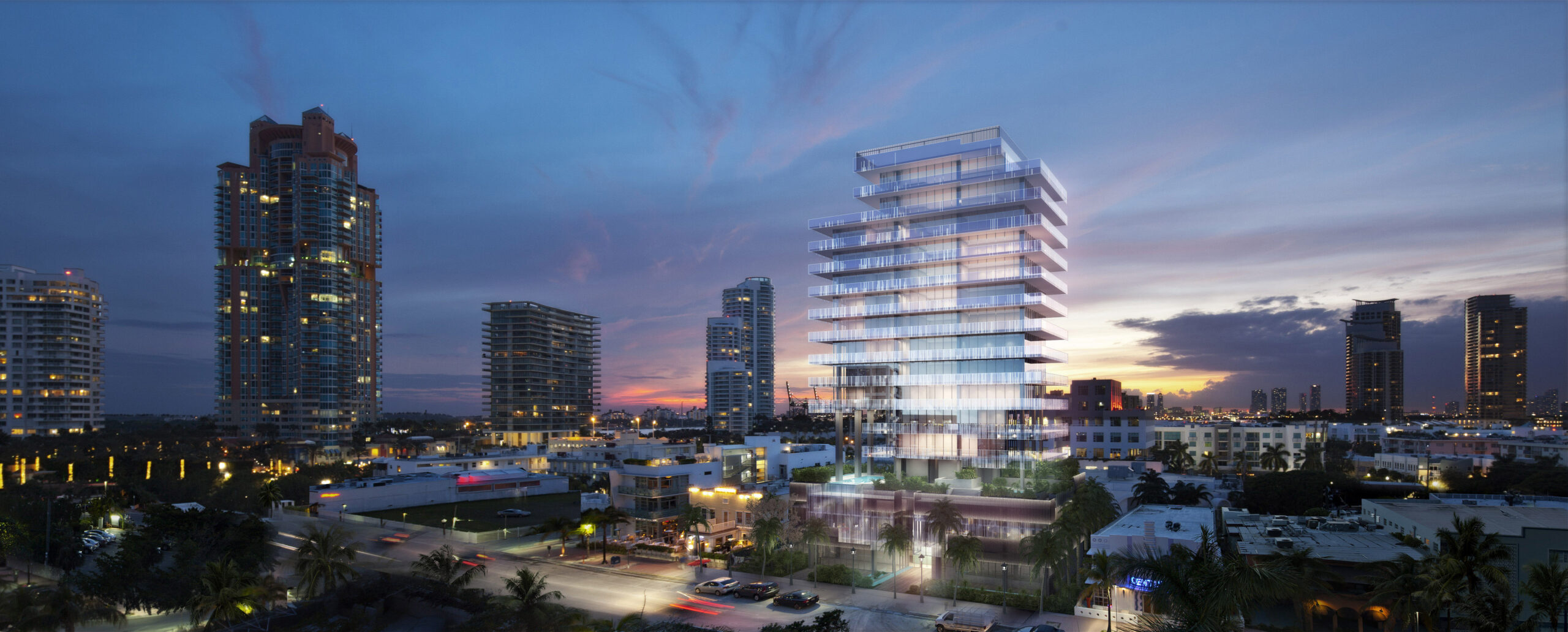 An 18-story residential tower, GLASS is situated on the southern tip of Miami Beach, in the South of Fifth Street neighborhood. Light and ethereal, GLASS is a response to its site, context, and environment. The building dematerializes as it rises, with its exterior almost disappearing into the atmosphere and its compositional use of fritted, patterned glass. GLASS reflects, captures and abstracts the natural landscape of sand, sea and sky, while retaining the essence of place through its architectural design, its materials, surface textures and tonal color.
