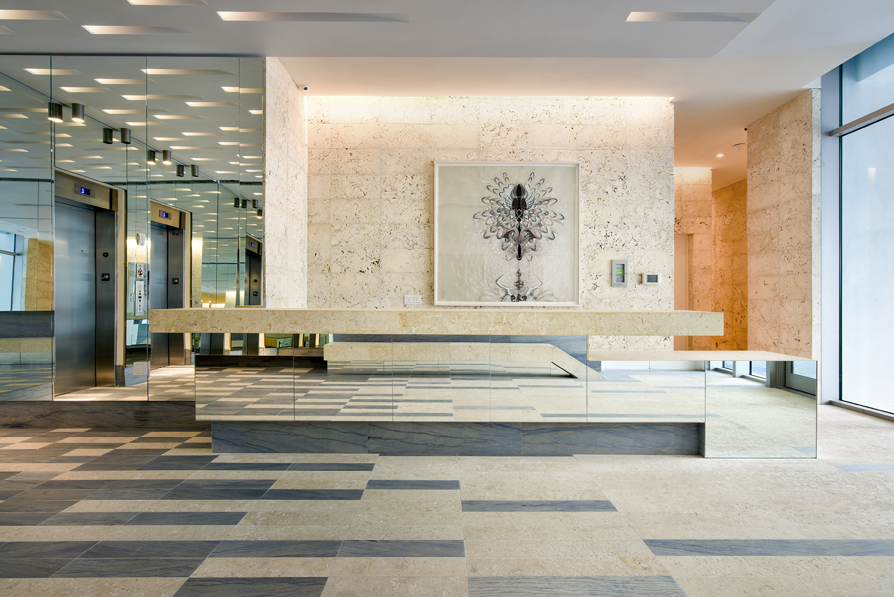 The building’s entrance is an immersive environment – at once luxurious and elemental, with natural light and areas with water that evoke the beach and the transition between sand and sea. Just as the gradient of color shifts from deep to shallow water, or the color of the sky changes as the eye travels upward from the horizon line, the experience of ascent within the building communicates this idea of movement. Conceived as an experiential space, the elevator contains an interactive installation, programmed to express the transition from water to sky with luminous, enlarged pixels of light and color patterns at each level. Artist Ivan Toth Depeña has collaborated with RGA on this interactive piece.