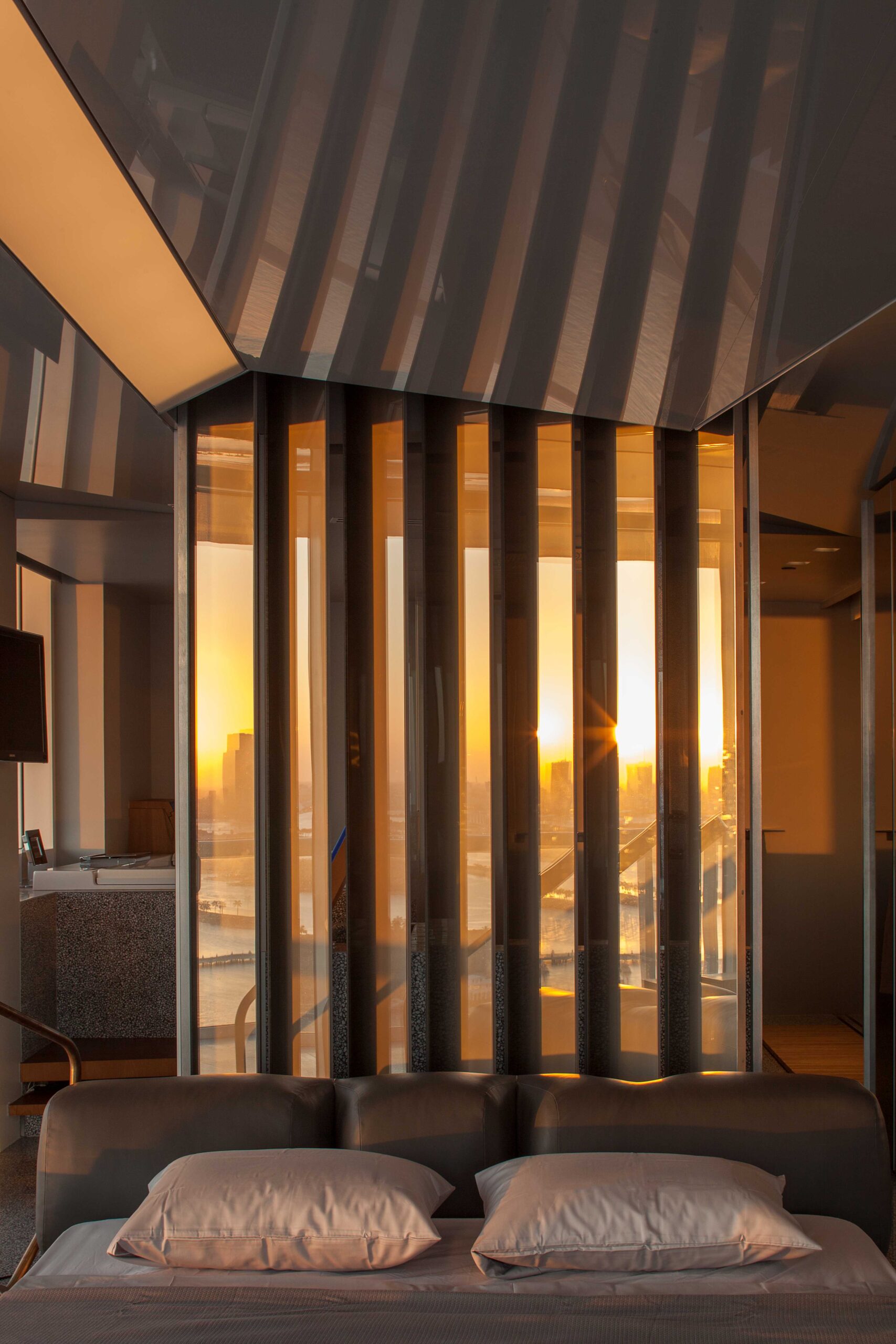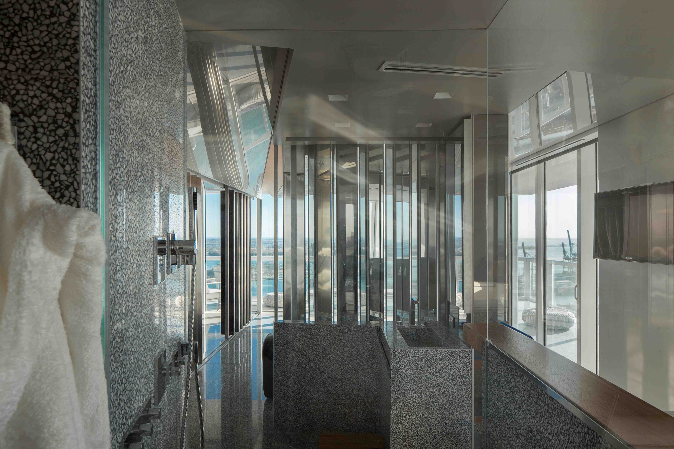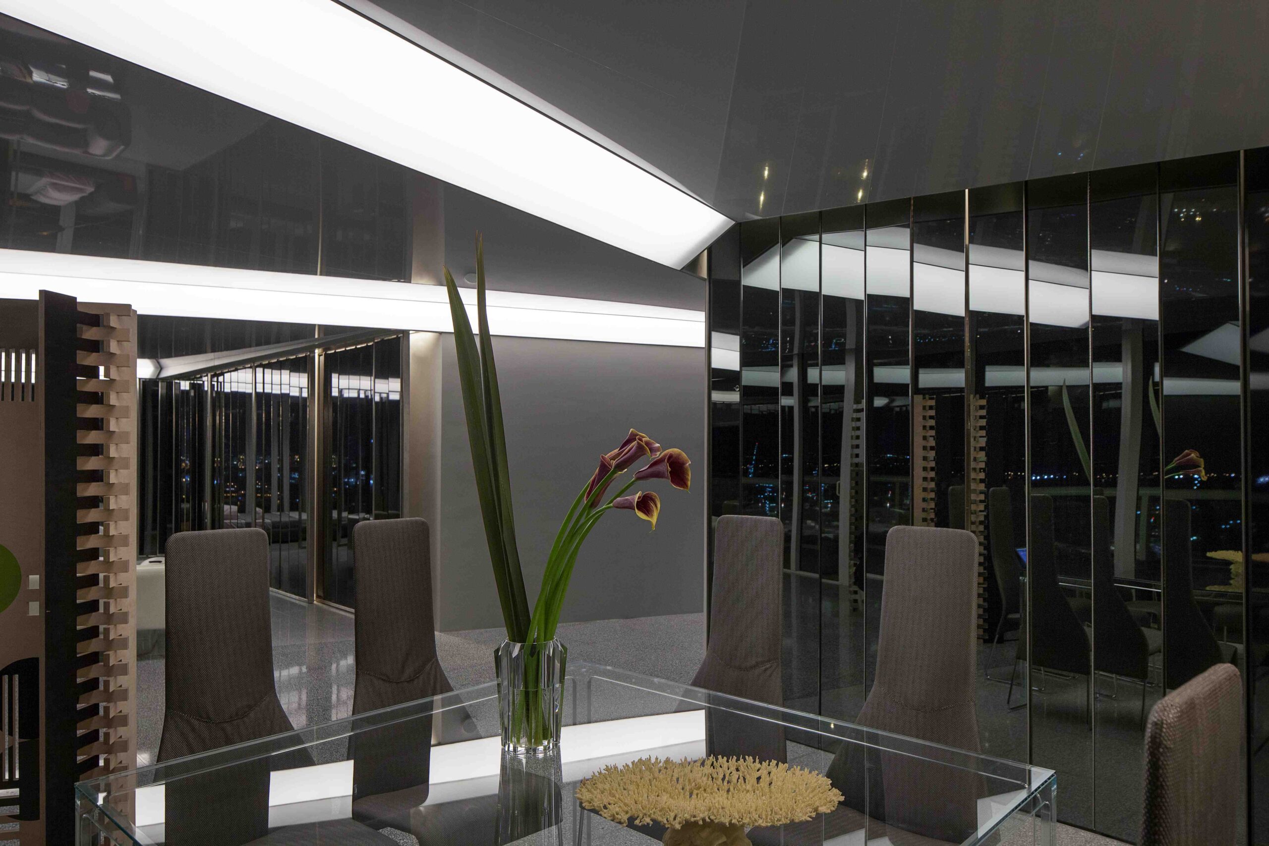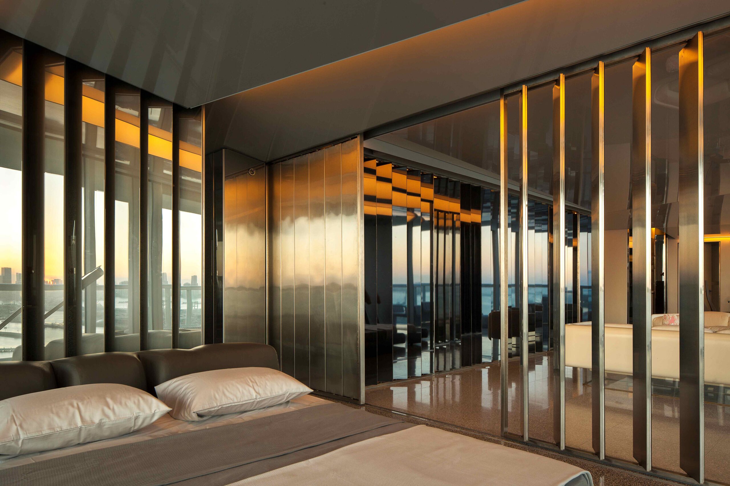 A series of sliding and pivoting grey mirrored panels forms the bulk of the apartment’s architecture and permits the space to maintain a sense of openness while simultaneously making every surface reflective. It also allows the residence to be closed off in some areas to maintain privacy. The flexibility of these panels provides a fluctuating and interactive series of rooms that can be customized to respond to varying times of day and to the changing needs of the occupants. The ceiling is composed of a saw-toothed, undulating, reflective surface that, together with the mirrored panels, amplifies the outside views and constantly changes with the weather and environment. The project also utilizes materials that purposefully contrast with the glossy quality of the glass including teak as well as dark and light grey terrazzo surfaces.