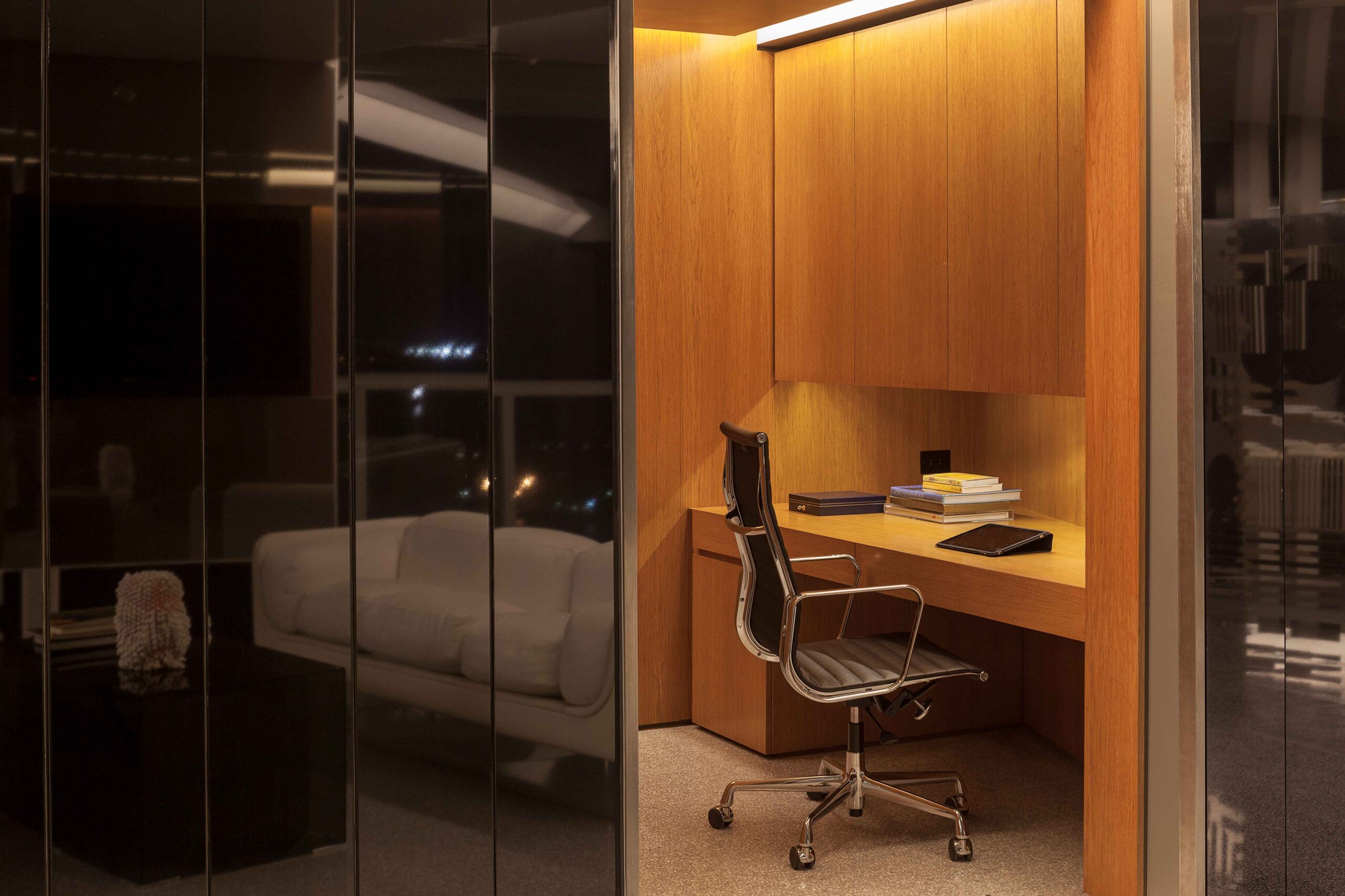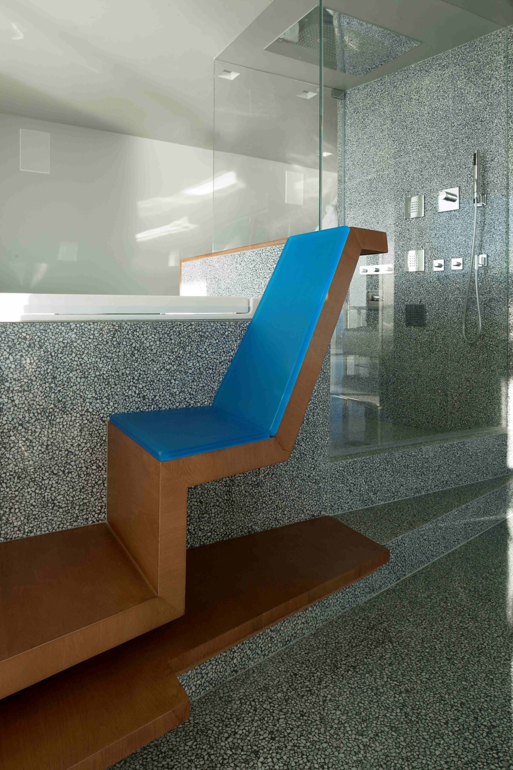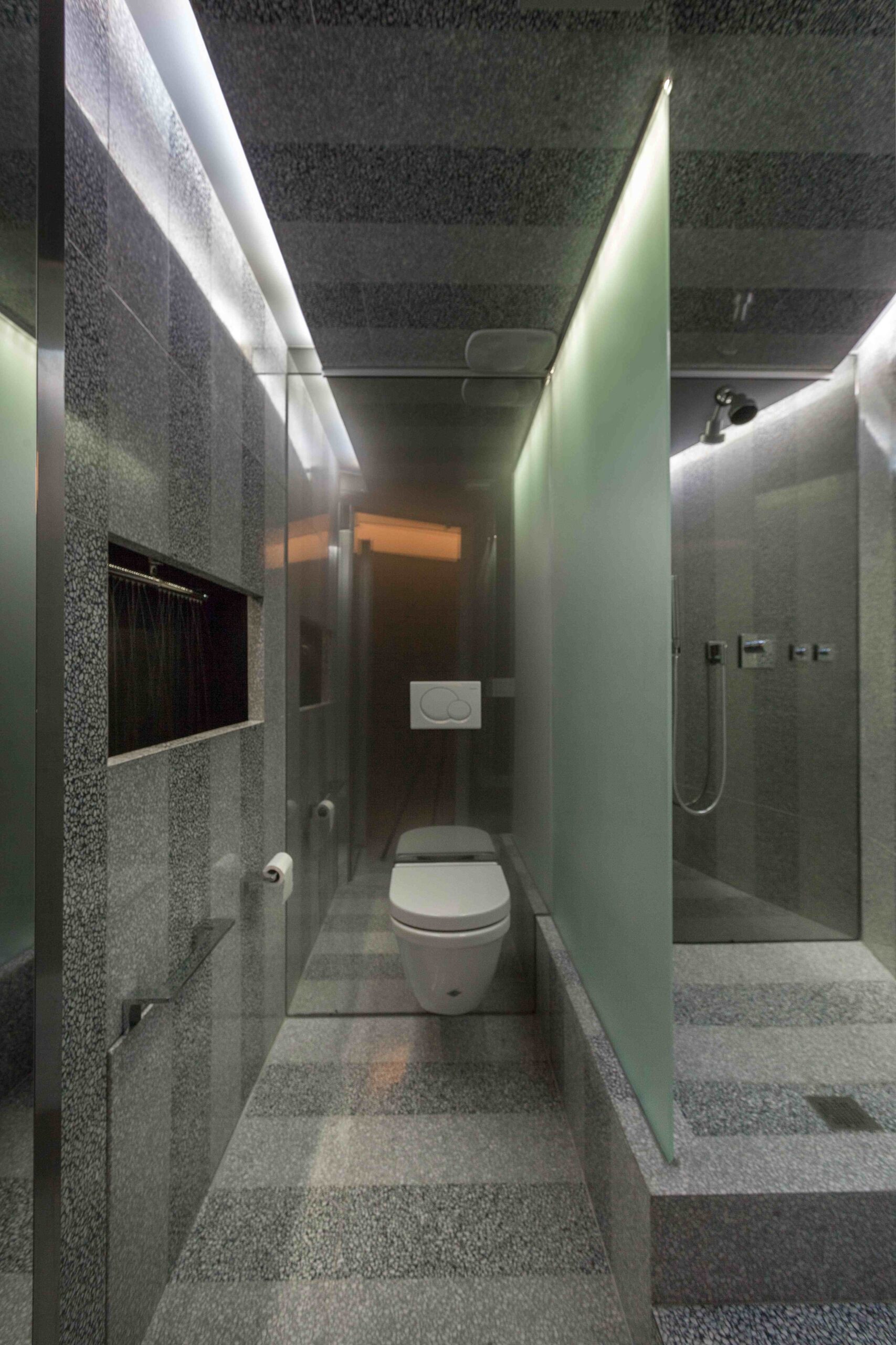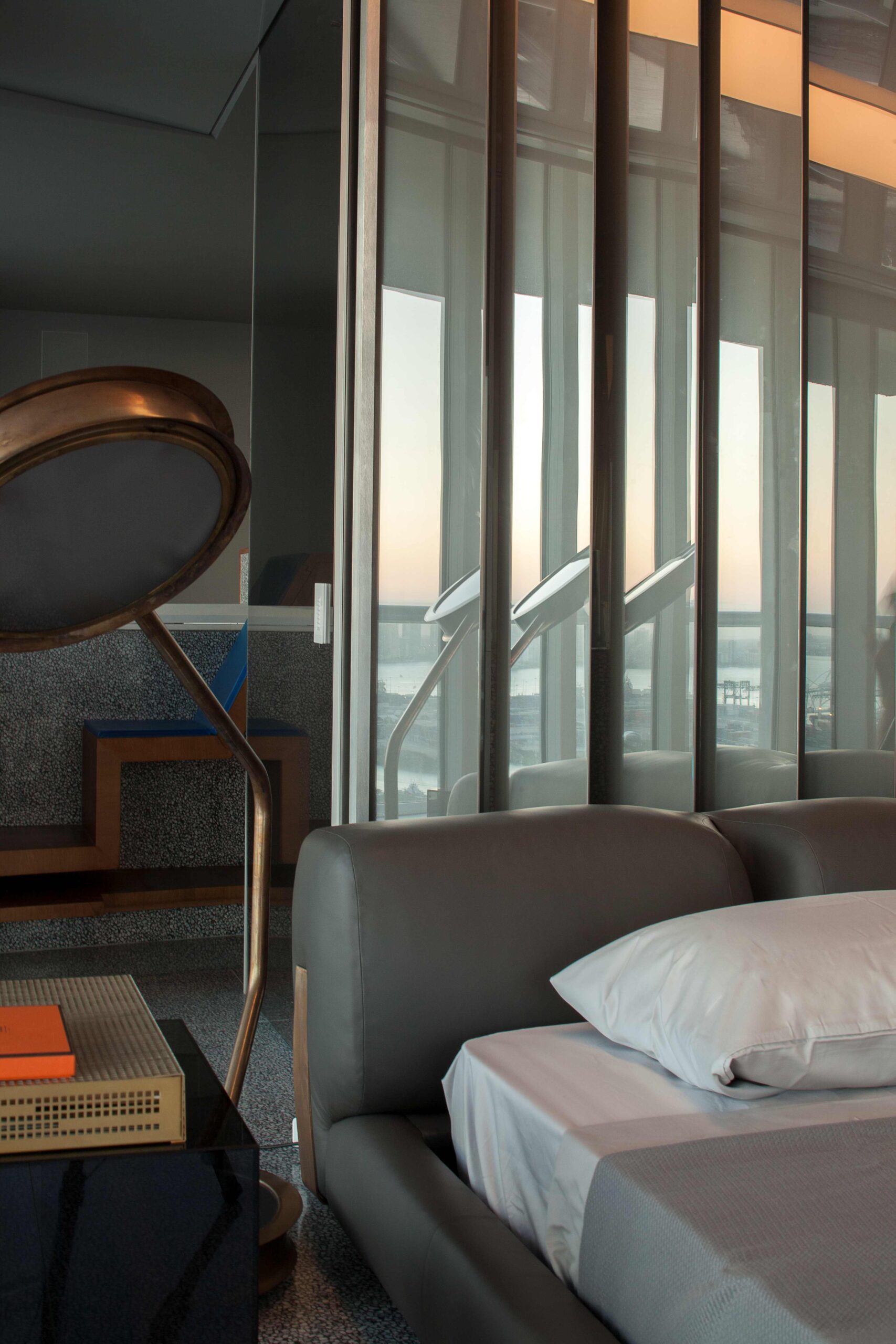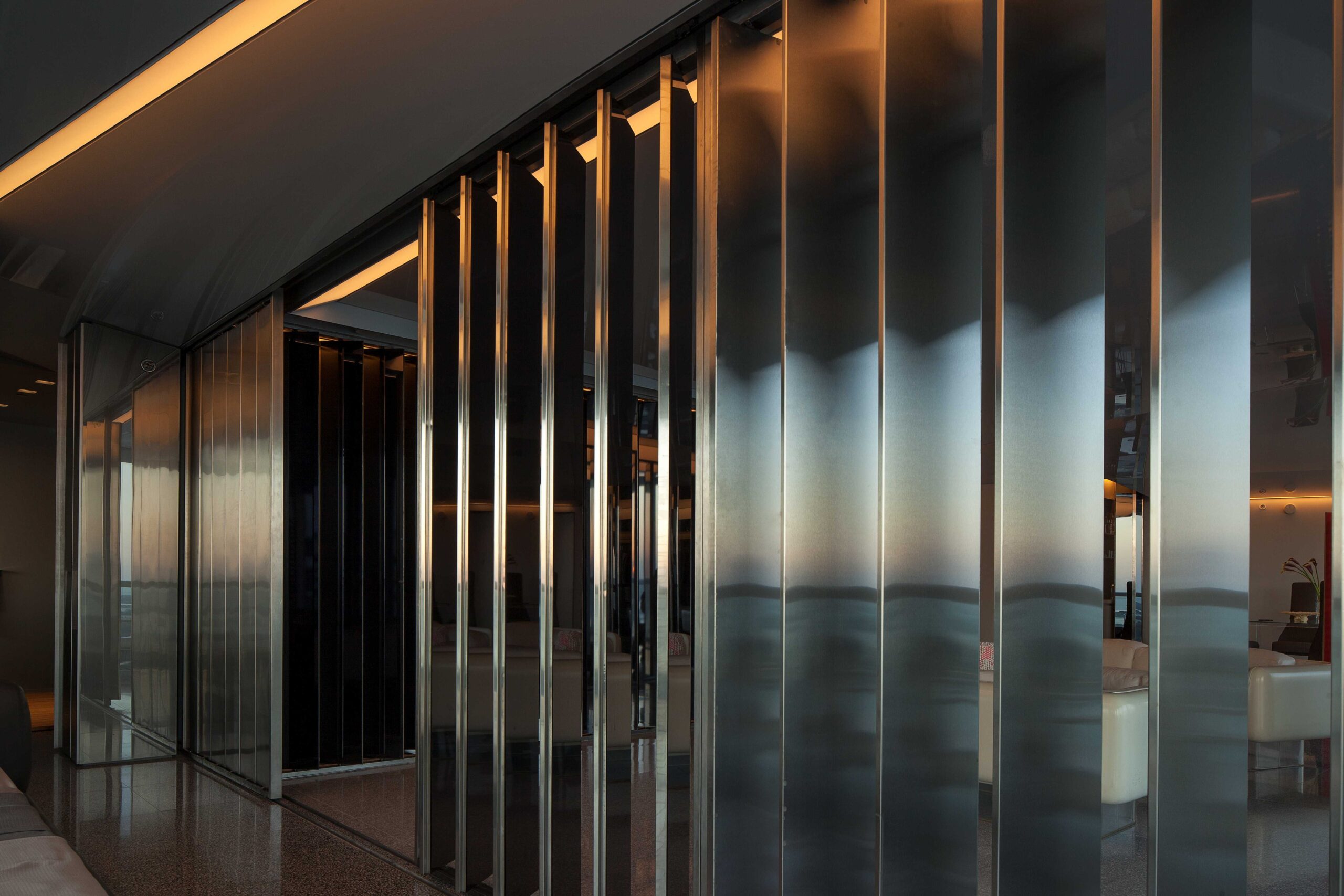 A series of sliding and pivoting grey mirrored panels forms the bulk of the apartment’s architecture and permits the space to maintain a sense of openness while simultaneously making every surface reflective. It also allows the residence to be closed off in some areas to maintain privacy. The flexibility of these panels provides a fluctuating and interactive series of rooms that can be customized to respond to varying times of day and to the changing needs of the occupants. The ceiling is composed of a saw-toothed, undulating, reflective surface that, together with the mirrored panels, amplifies the outside views and constantly changes with the weather and environment. The project also utilizes materials that purposefully contrast with the glossy quality of the glass including teak as well as dark and light grey terrazzo surfaces.