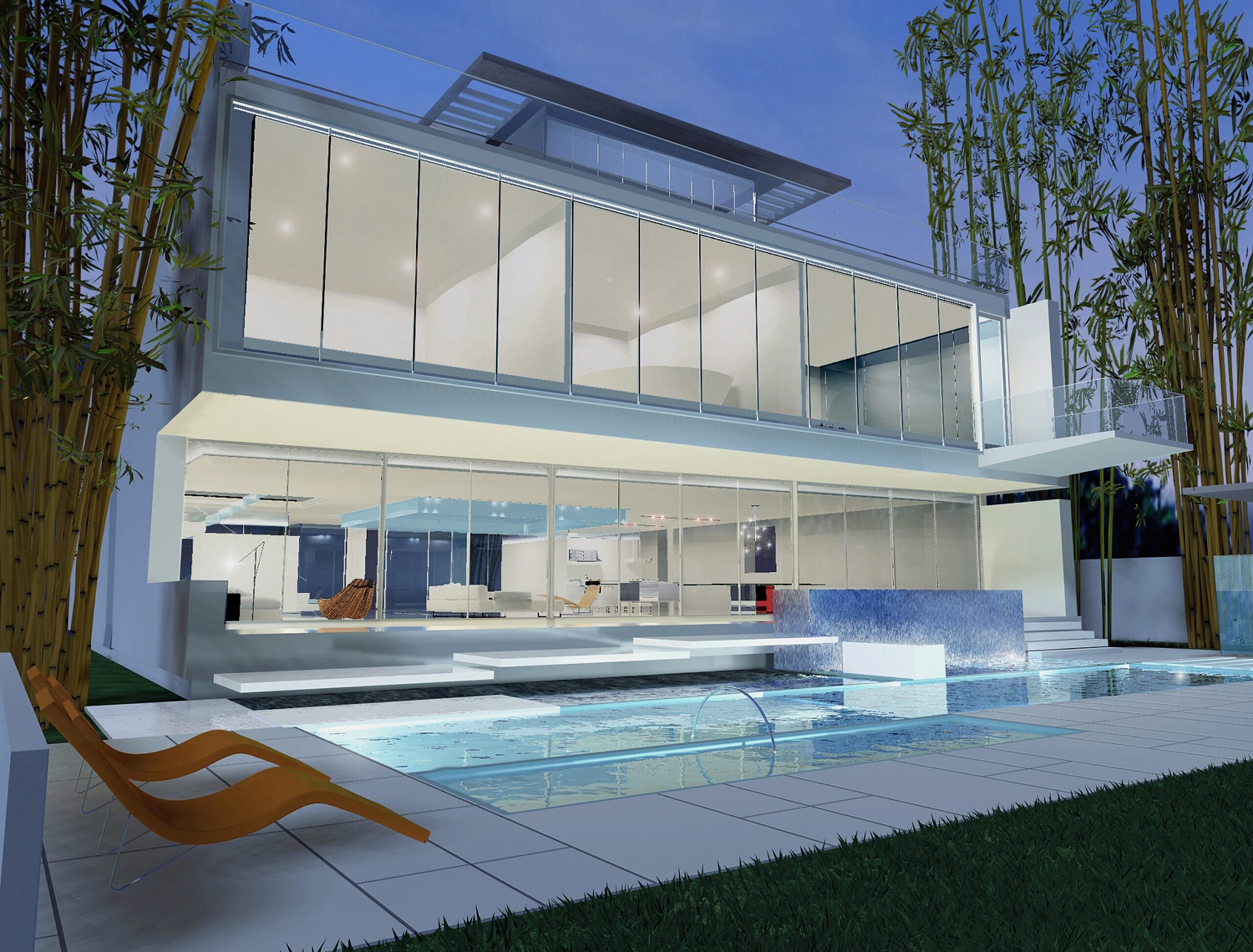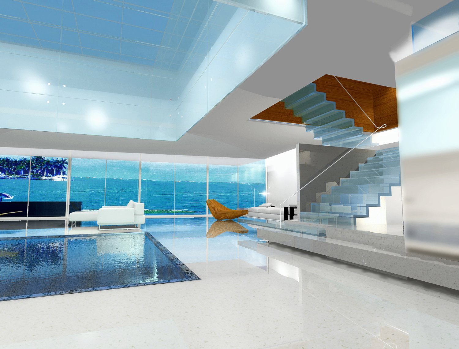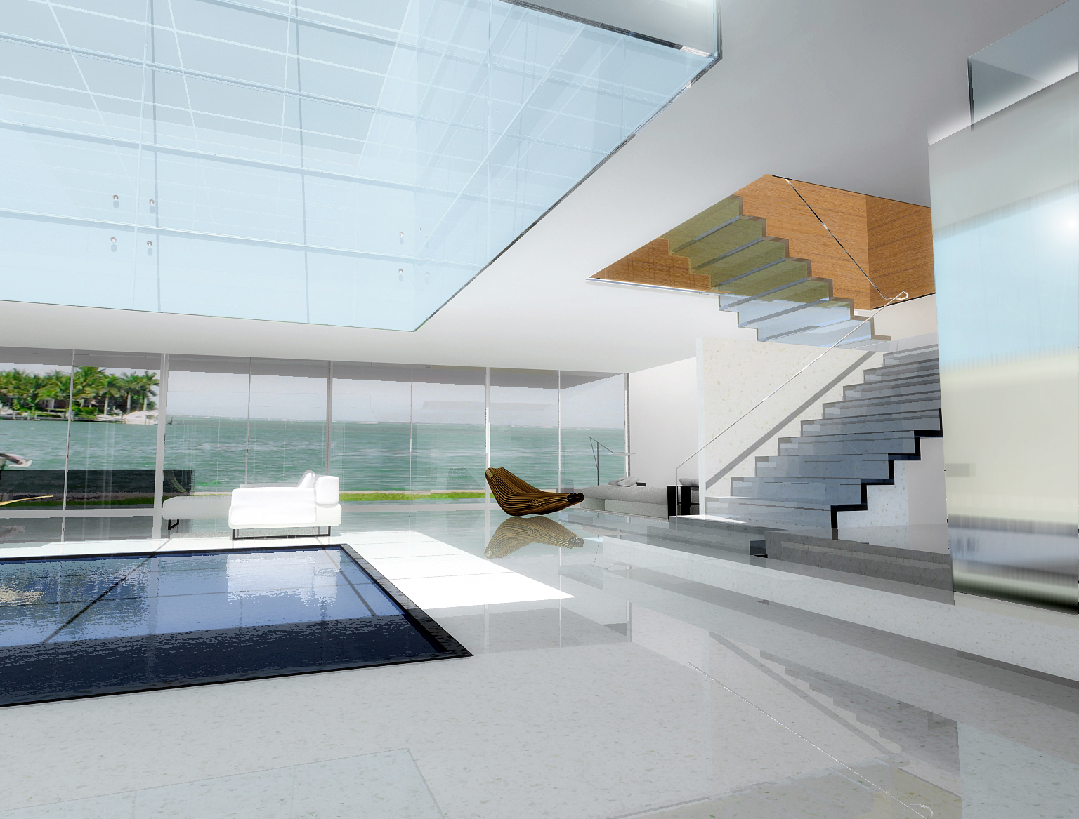 The house proactively can “feel” and “see” the beauty of its stunning Key Biscayne waterfront site. This is mainly achieved through a “light chamber” constructed of sun responsive, dichroic glass. Similar to photo-sensitive eyeglass lenses – this translucent element functions as an environmental reader subtly shifting in both hue and intensity in accordance with the changes in natural light throughout the day. At its base is a meditative pool which reinforces the connection to the exterior environment.