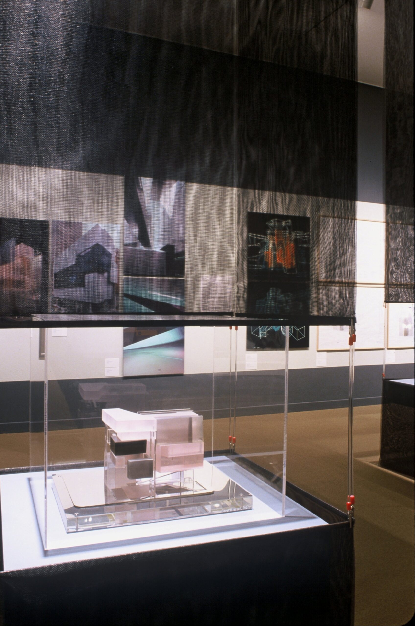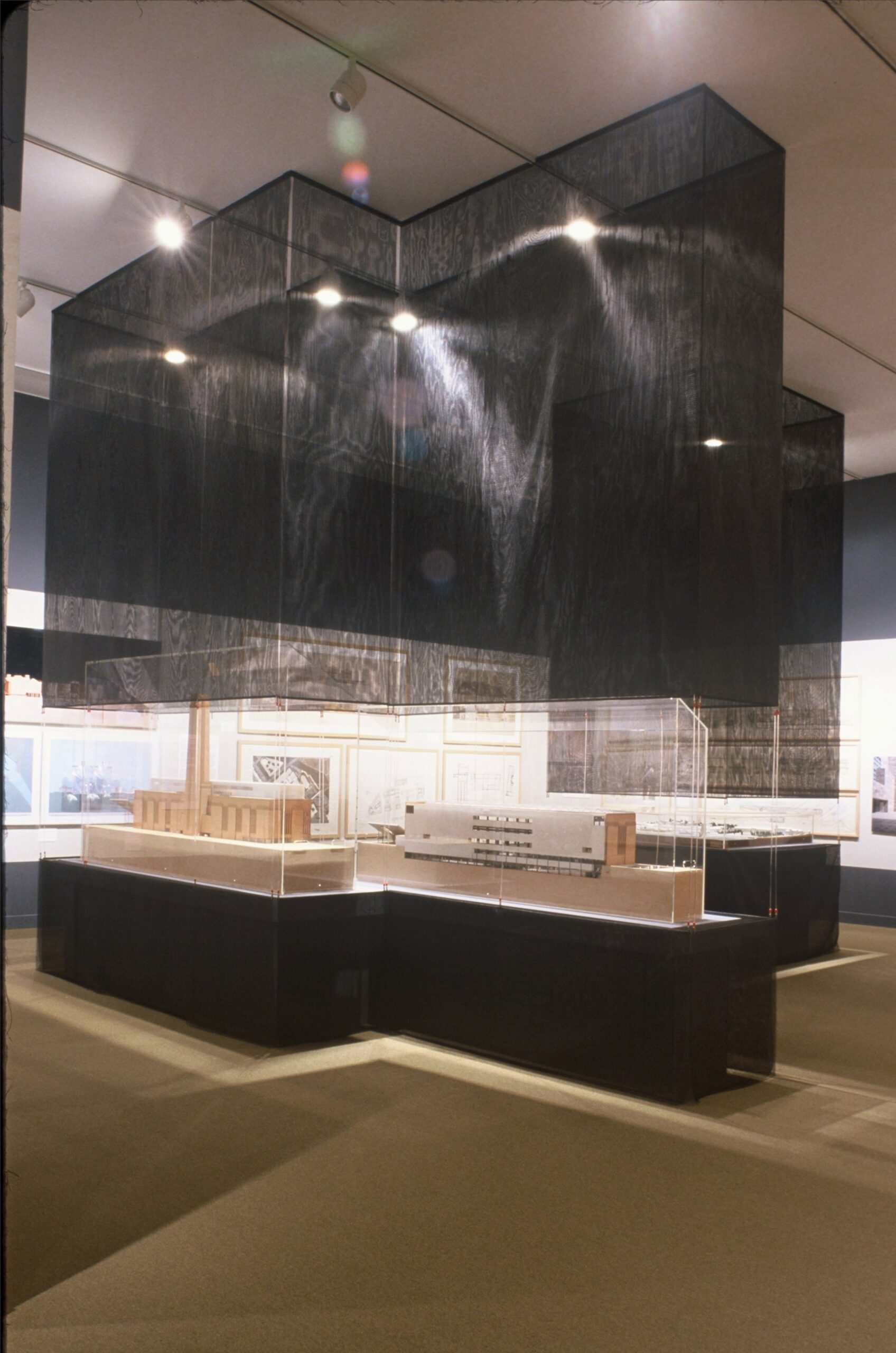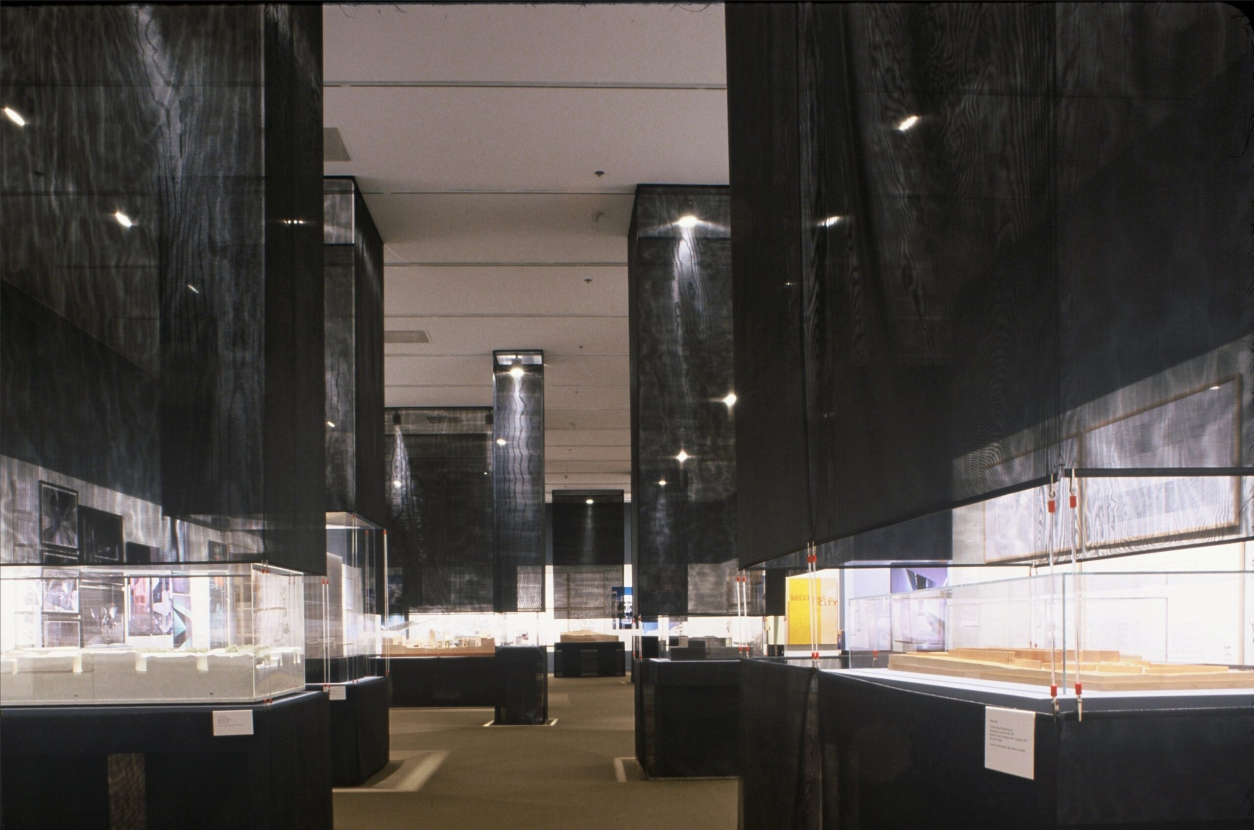 Within the vast open space of the gallery, the project models are encased in translucent black mosquito mesh scrim columns lit from within to create a dense landscape of towers.
