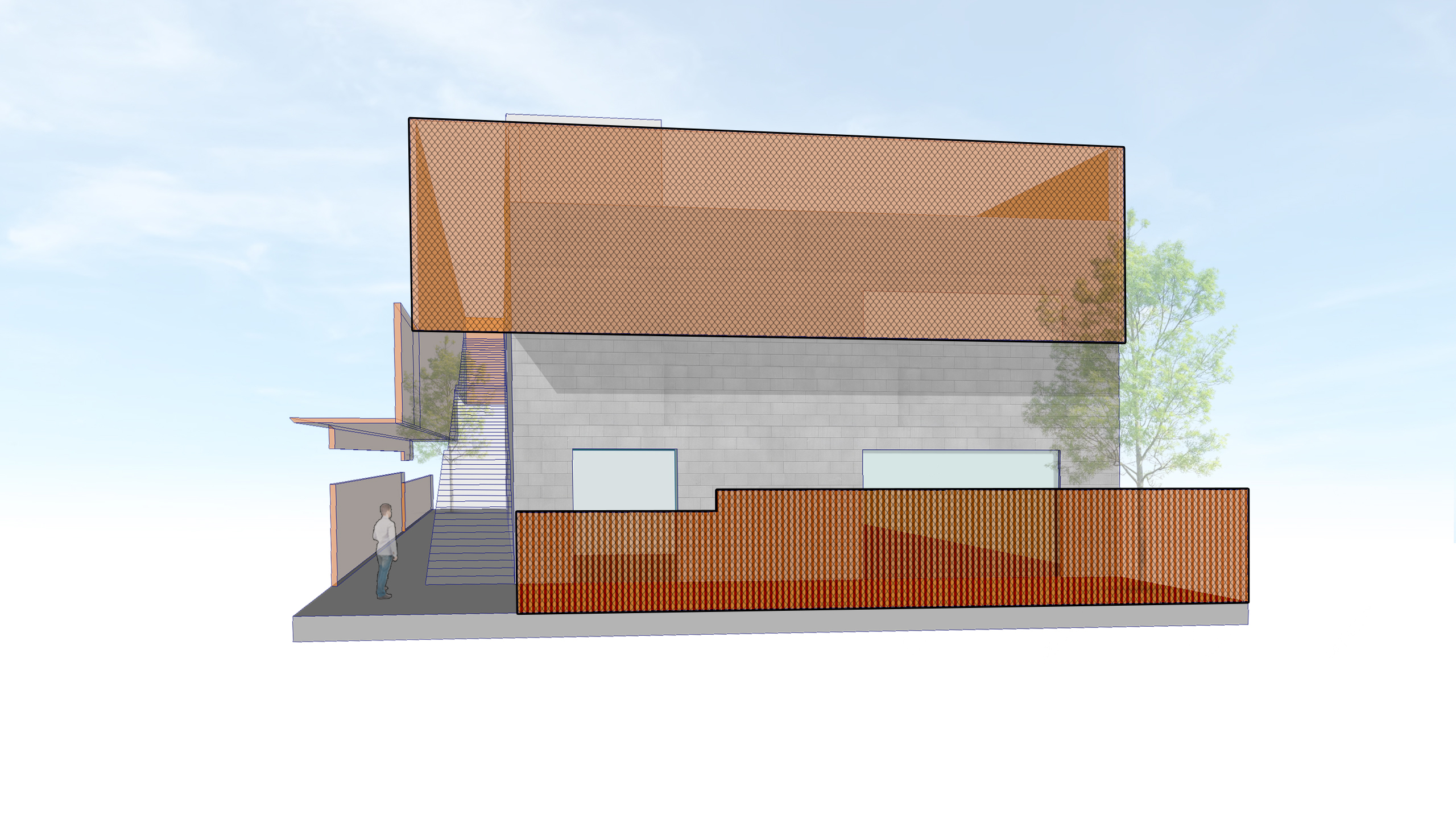 The project juxtaposes two ubiquitous materials found throughout the neighborhood, concrete block and chain-link fencing, by accentuating their inherent qualities rather than concealing them.