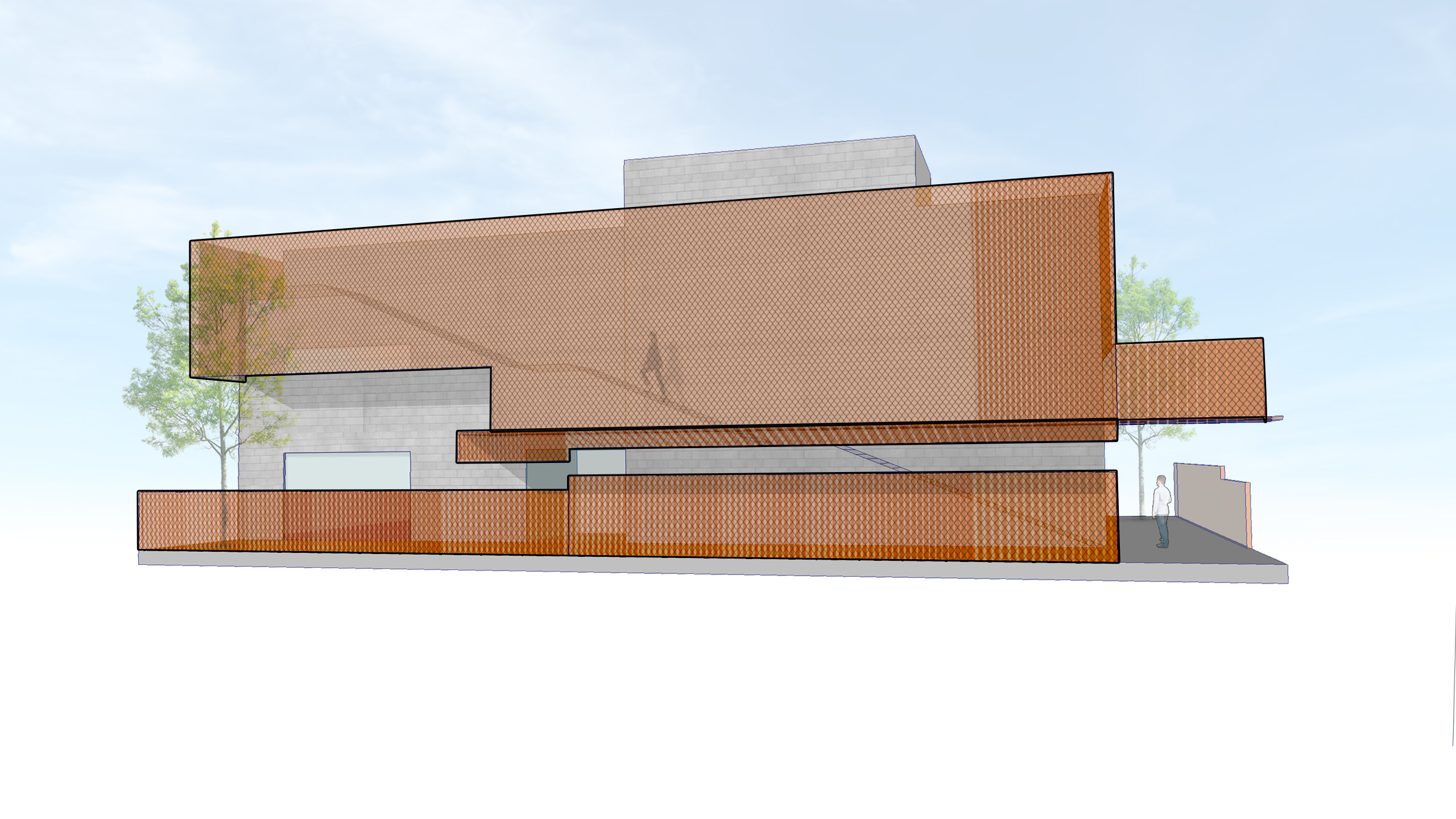 The project juxtaposes two ubiquitous materials found throughout the neighborhood, concrete block and chain-link fencing, by accentuating their inherent qualities rather than concealing them. The colorless gray concrete block is left exposed, with horizontal grout lines allowed to ooze outward, giving the walls a rough, unfinished, and grounded character. This heavy, solid mass becomes a contrasting backdrop to a delicate, floating veil of chain-link fencing that wraps and folds around the building.
