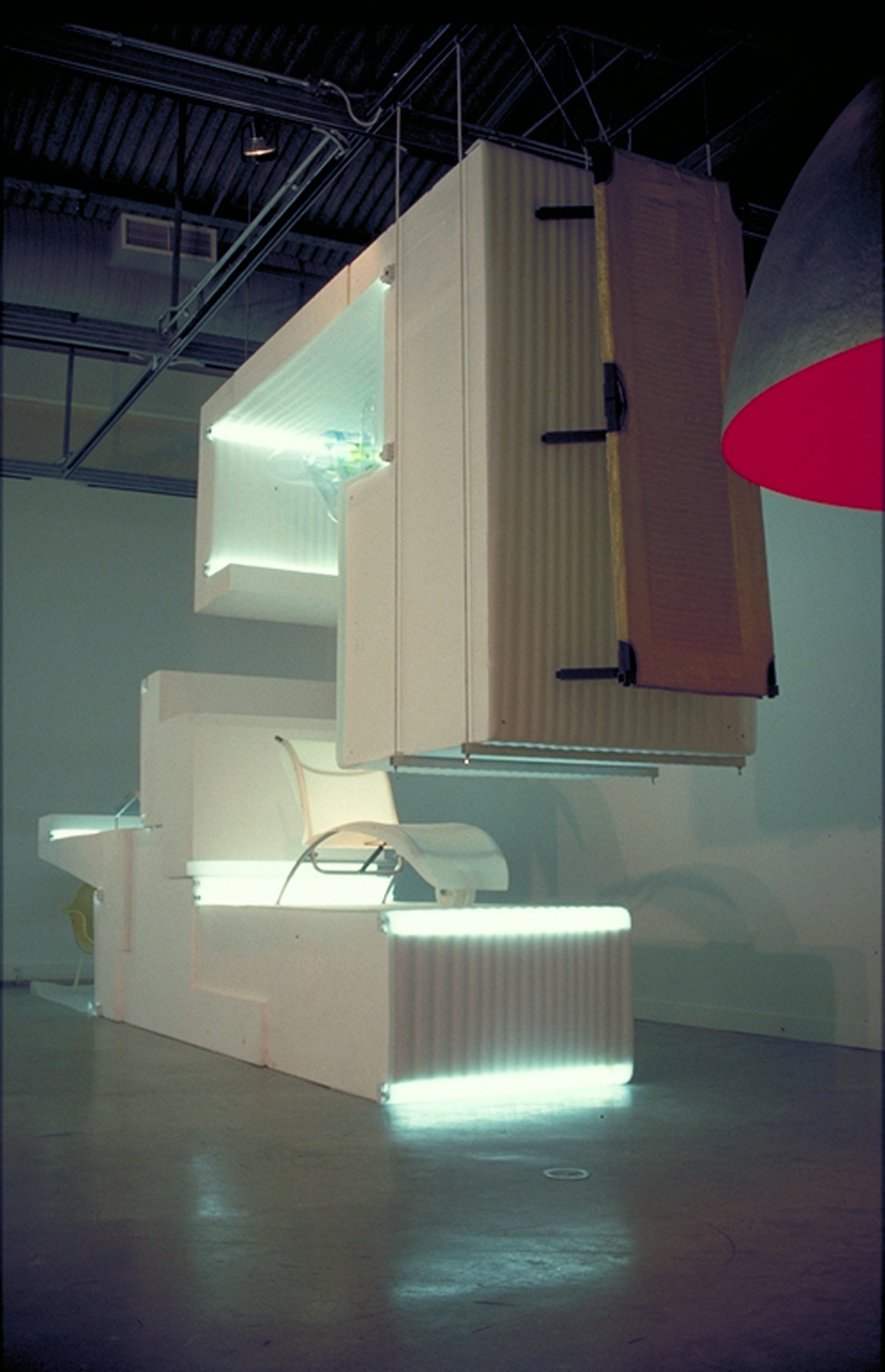 The installation was constructed from 1700 linear feet of polyethylene foam softly bending around 160 standard fluorescent tubes and 66 chiseled blocks of foam. The foam was not only utilized for its lightness, and commonality but it is also sexy, and could be reused by the museum staff to repackage the items in the exhibition. The vertical layers of rolled foam create translucent artificial skins in the space and present glimpses of the objects without revealing the whole. The sense of mystery creates seduction, allowing people to see and be seen simultaneously while directly positioning them as part of the exhibition.