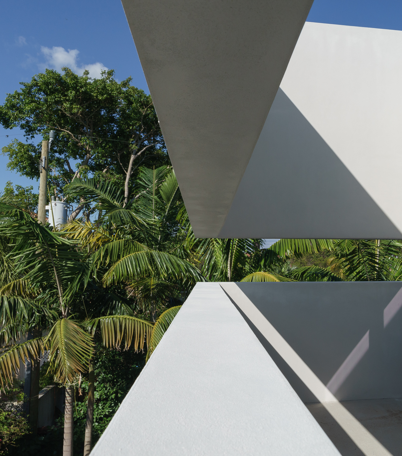 The house itself is a series of interlocking and overlapping volumes with voids, allowing for spatial complexity and spaces that snake through the house. Because the floor level is elevated to be free from flooding, one must ascend to enter. The reflecting pools at the entry and visible pool at the rear of the house contribute to the sensory, floating quality of this private home.