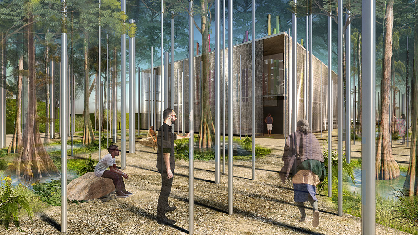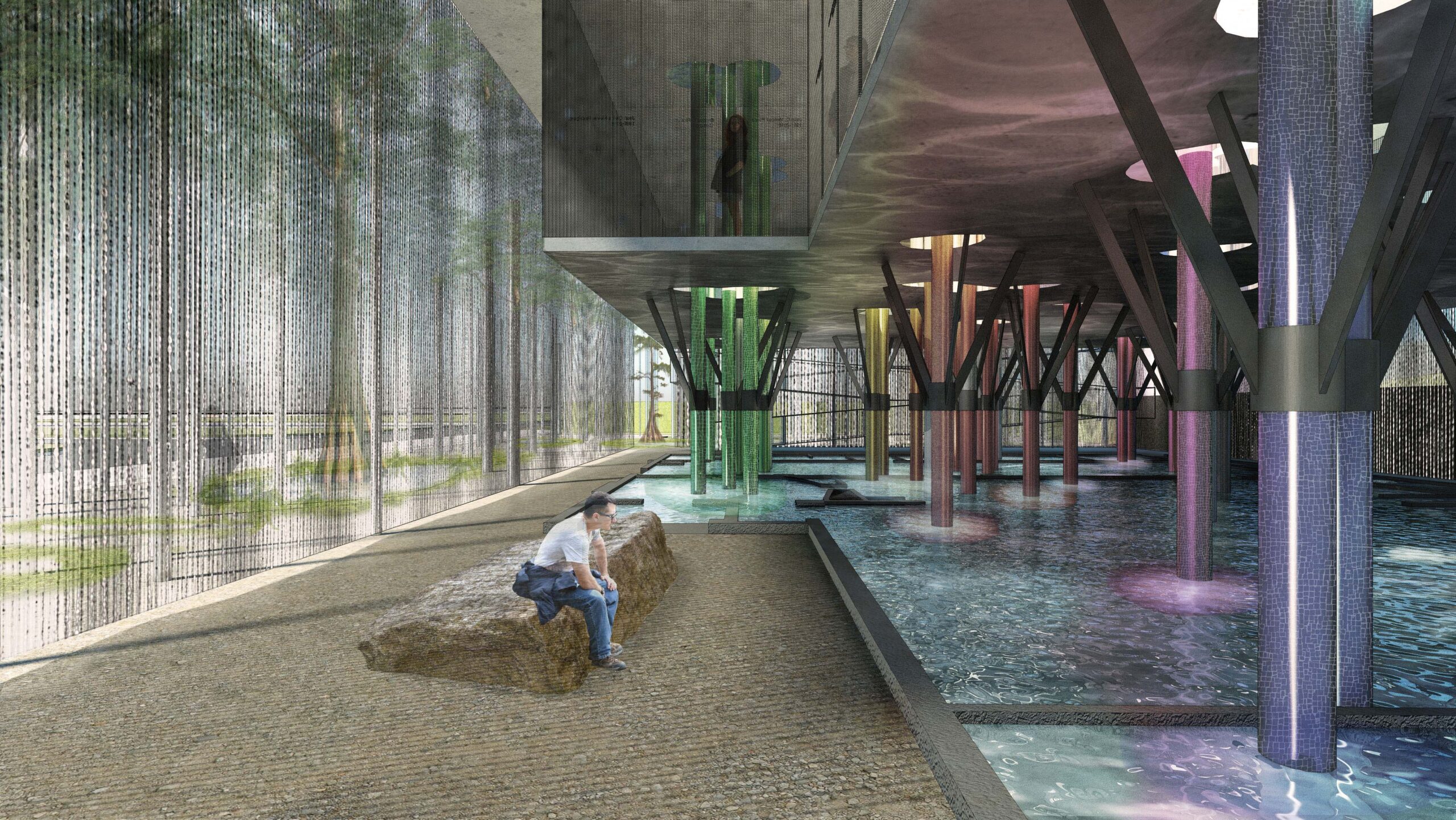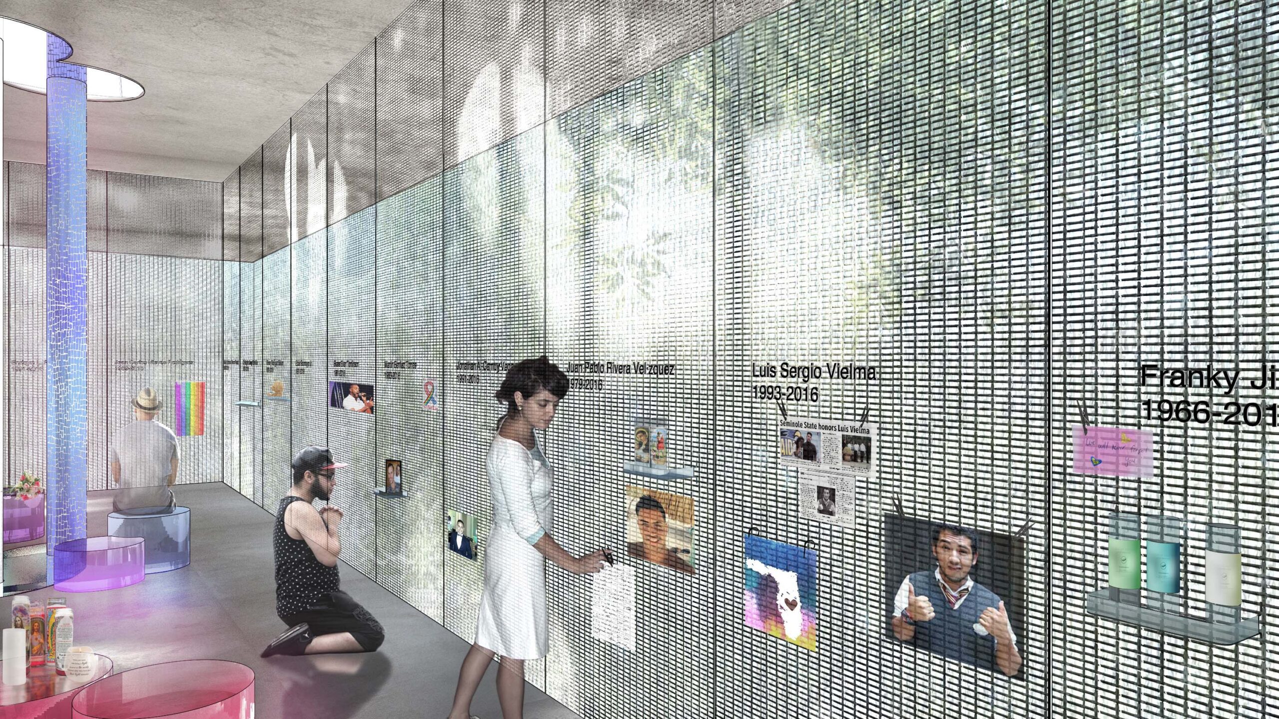 The design team – comprised of Diller Scofidio + Renfro and Rene Gonzalez Architects, with Raymond Jungles, Teresita Fernández, and Oliver Beer – developed a Memorial design proposing a garden and sanctuary that is both solemn and celebratory. The sanctuary sits within a contemplative sound garden of cypress trees and natural ponds, with 268 reflective columns, each of which honors the life of an individual who was affected but survived the shooting. Integrated into these columns is a sound installation that creates a symphony of music as visitors approach. A delicately draped, beaded shroud protects the walls of the original club. Ascending above the original structure, visitors enter the sanctuary, which is supported by 49 rainbow-colored ceramic tile columns commemorating the 49 lives taken. These columns dance and ascend towards the sky, unbroken and strong, while physically supporting the roof and the floor. Circular glass openings surrounding these columns open views down to the original club and dance floor below, while tinted glass skylights fill the space with shimmering colored light from above. A perimeter scrim covered with mementos left by mourners displays the names of the 49 victims.