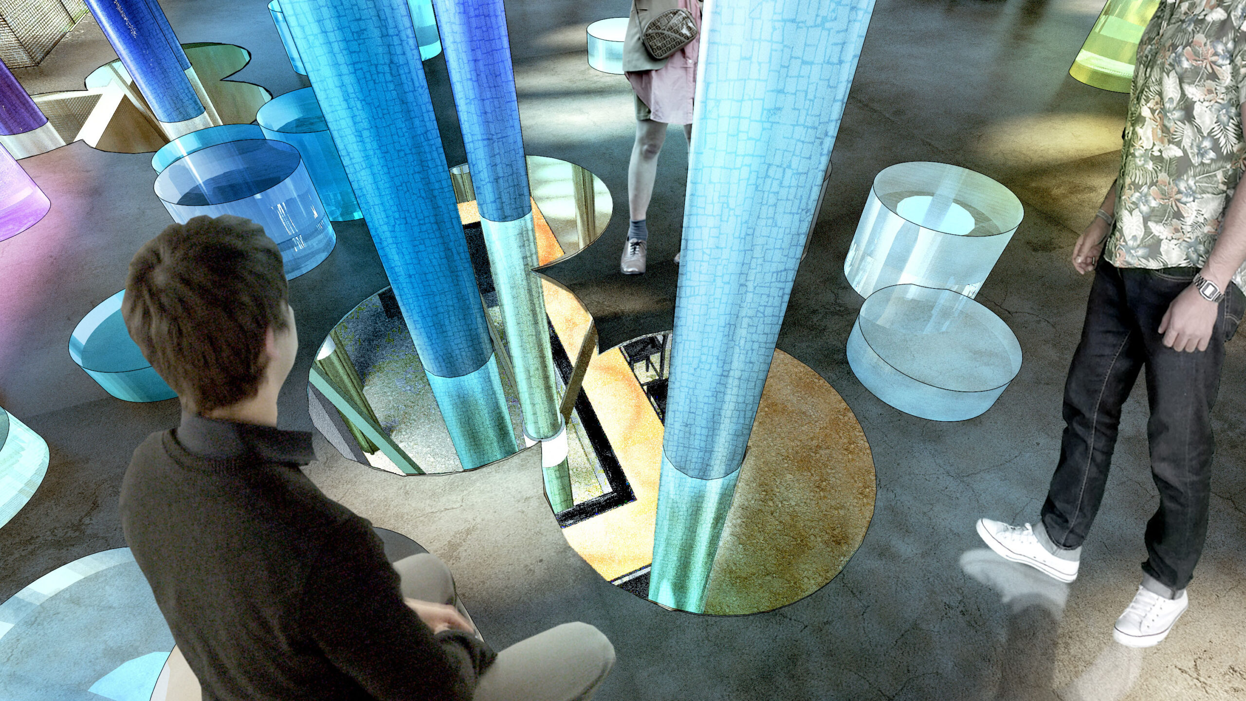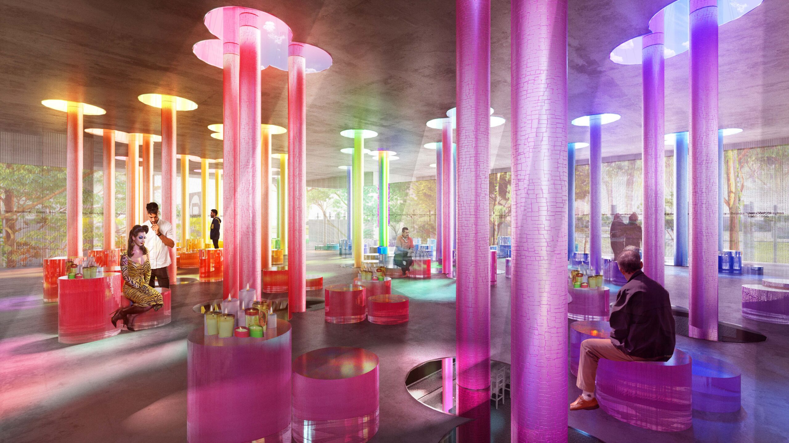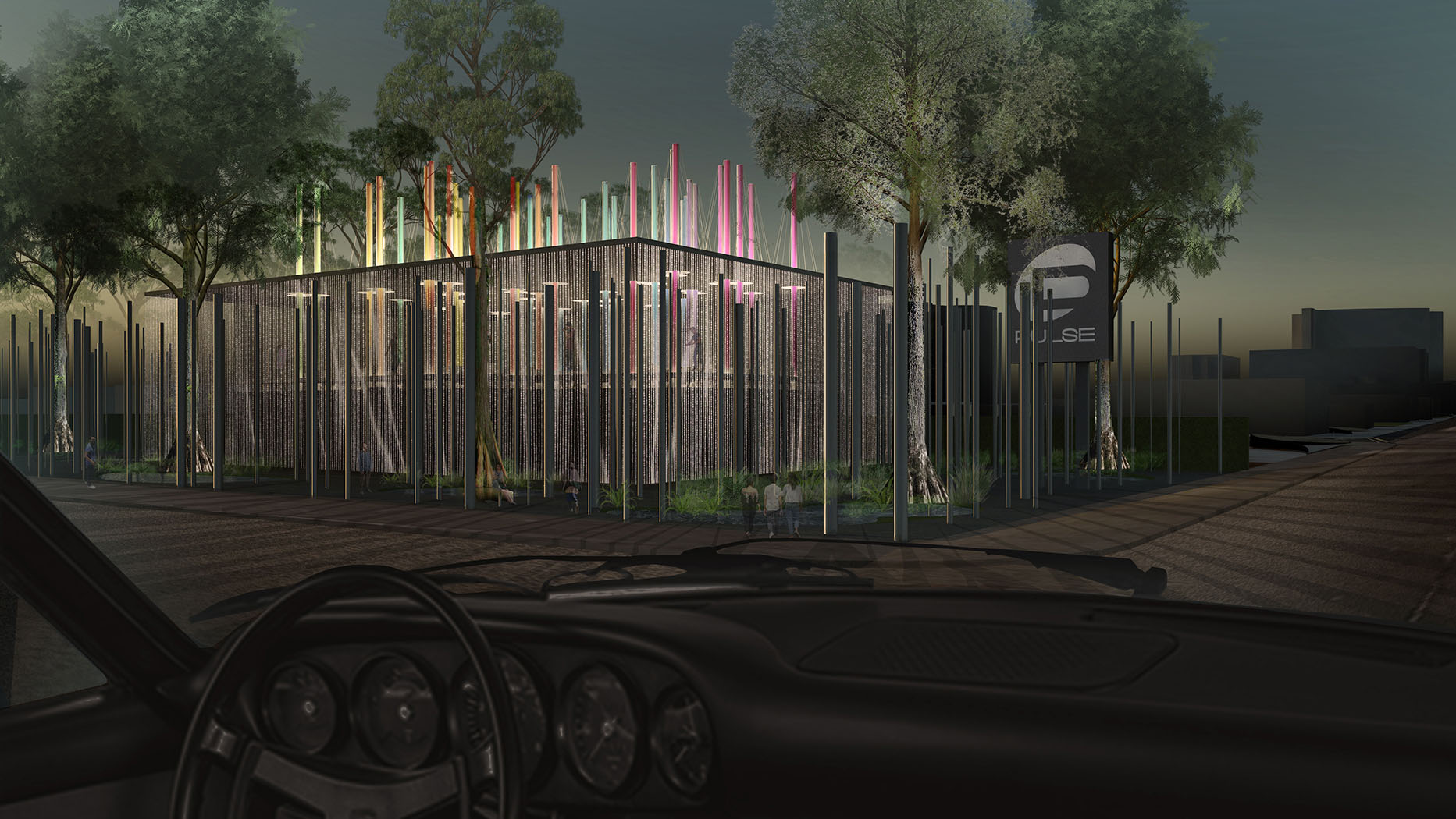 The design team – comprised of Diller Scofidio + Renfro and Rene Gonzalez Architects, with Raymond Jungles, Teresita Fernández, and Oliver Beer – developed a Memorial design proposing a garden and sanctuary that is both solemn and celebratory. The sanctuary sits within a contemplative sound garden of cypress trees and natural ponds, with 268 reflective columns, each of which honors the life of an individual who was affected but survived the shooting. Integrated into these columns is a sound installation that creates a symphony of music as visitors approach. A delicately draped, beaded shroud protects the walls of the original club. Ascending above the original structure, visitors enter the sanctuary, which is supported by 49 rainbow-colored ceramic tile columns commemorating the 49 lives taken. These columns dance and ascend towards the sky, unbroken and strong, while physically supporting the roof and the floor. Circular glass openings surrounding these columns open views down to the original club and dance floor below, while tinted glass skylights fill the space with shimmering colored light from above. A perimeter scrim covered with mementos left by mourners displays the names of the 49 victims.