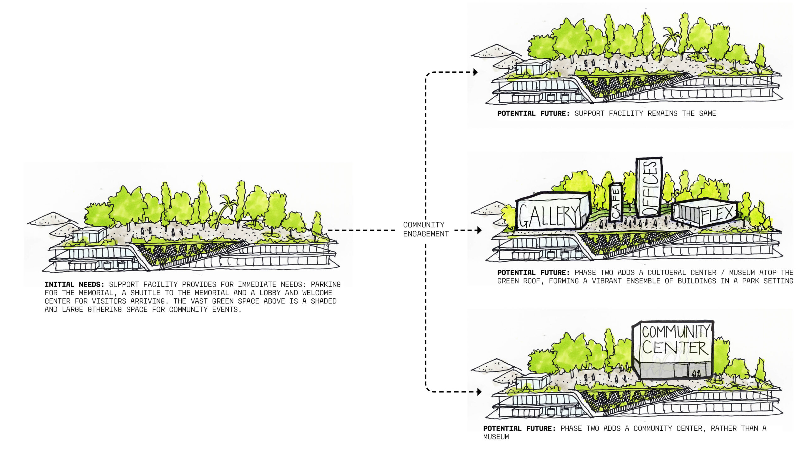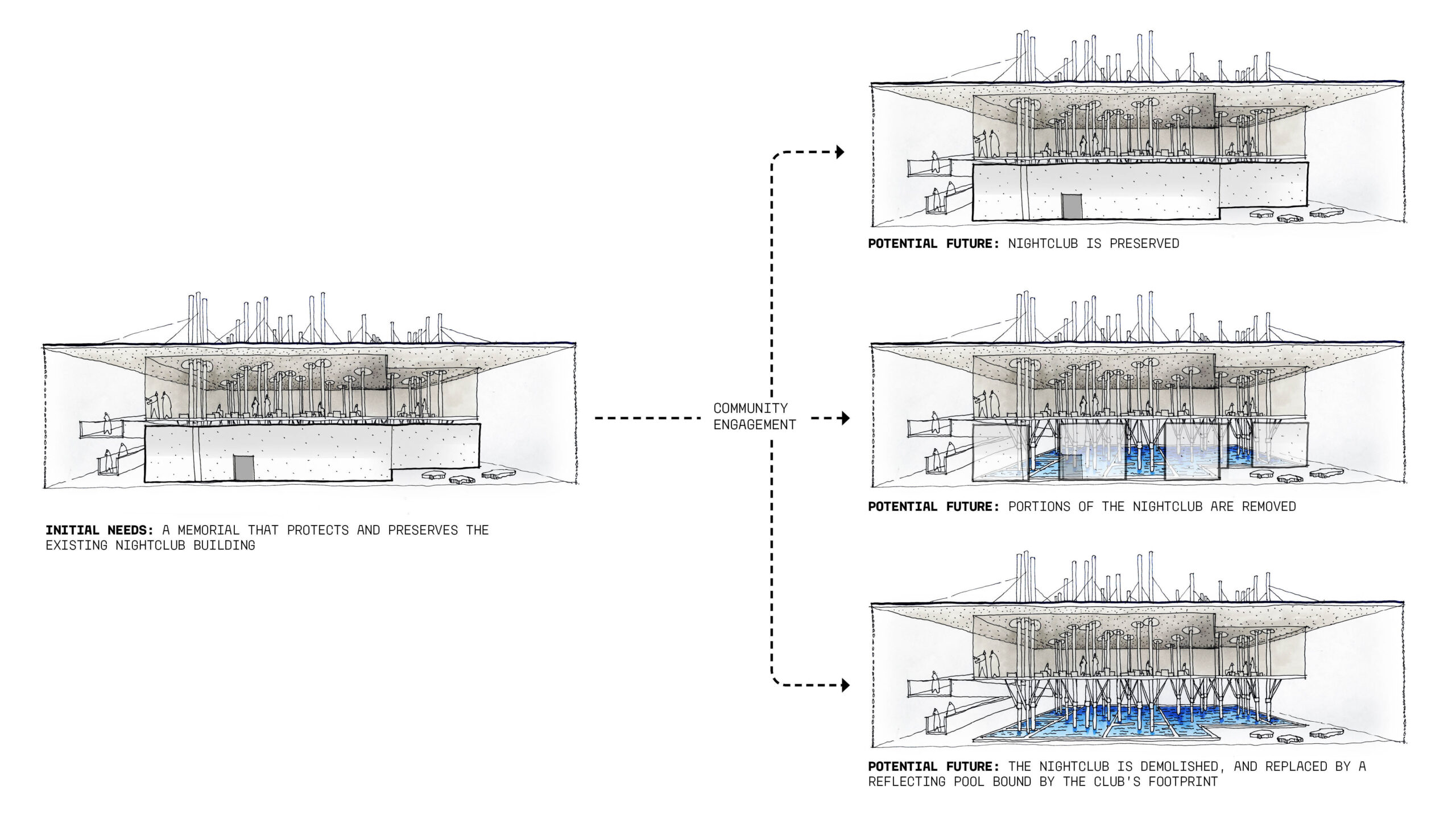 The proposed competition design for the Pulse Memorial & Museum in Orlando, Florida, by Rene Gonzalez Architects and Diller Scofidio + Renfro reconsiders the program by consolidating the Pulse Archive of artifacts at the Memorial, maintaining that everything related to the remembrance of Pulse should remain on the original site, rather than being relocated to the site designated for a new museum. As a result, the museum site can be redefined as a flexible support facility for the Memorial, developed thoughtfully through engagement with the community to respond to their needs over time. This departure from the competition brief’s directives is one of the key approaches that distinguishes the team’s response from the proposals of their six fellow shortlisted finalists.