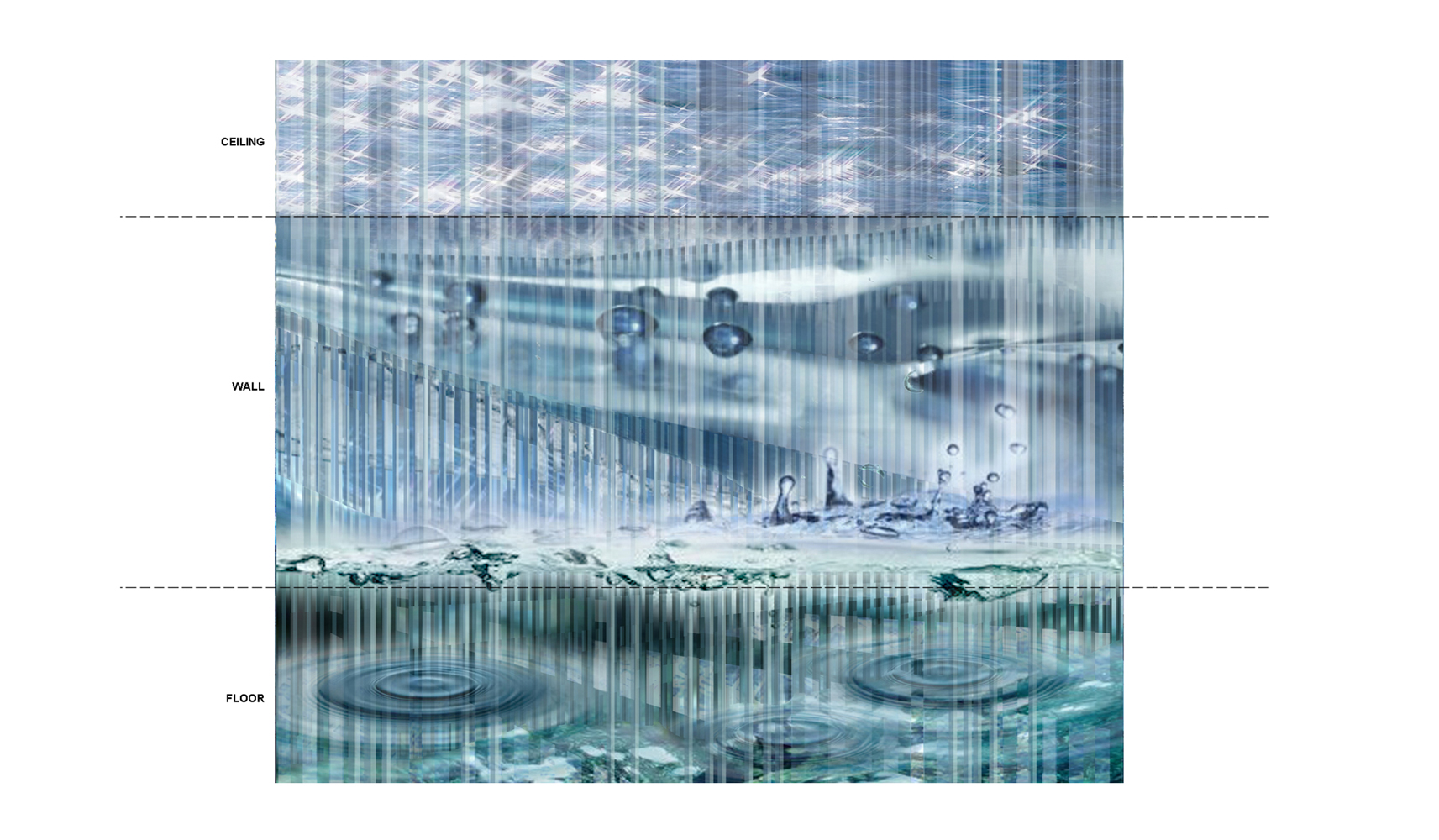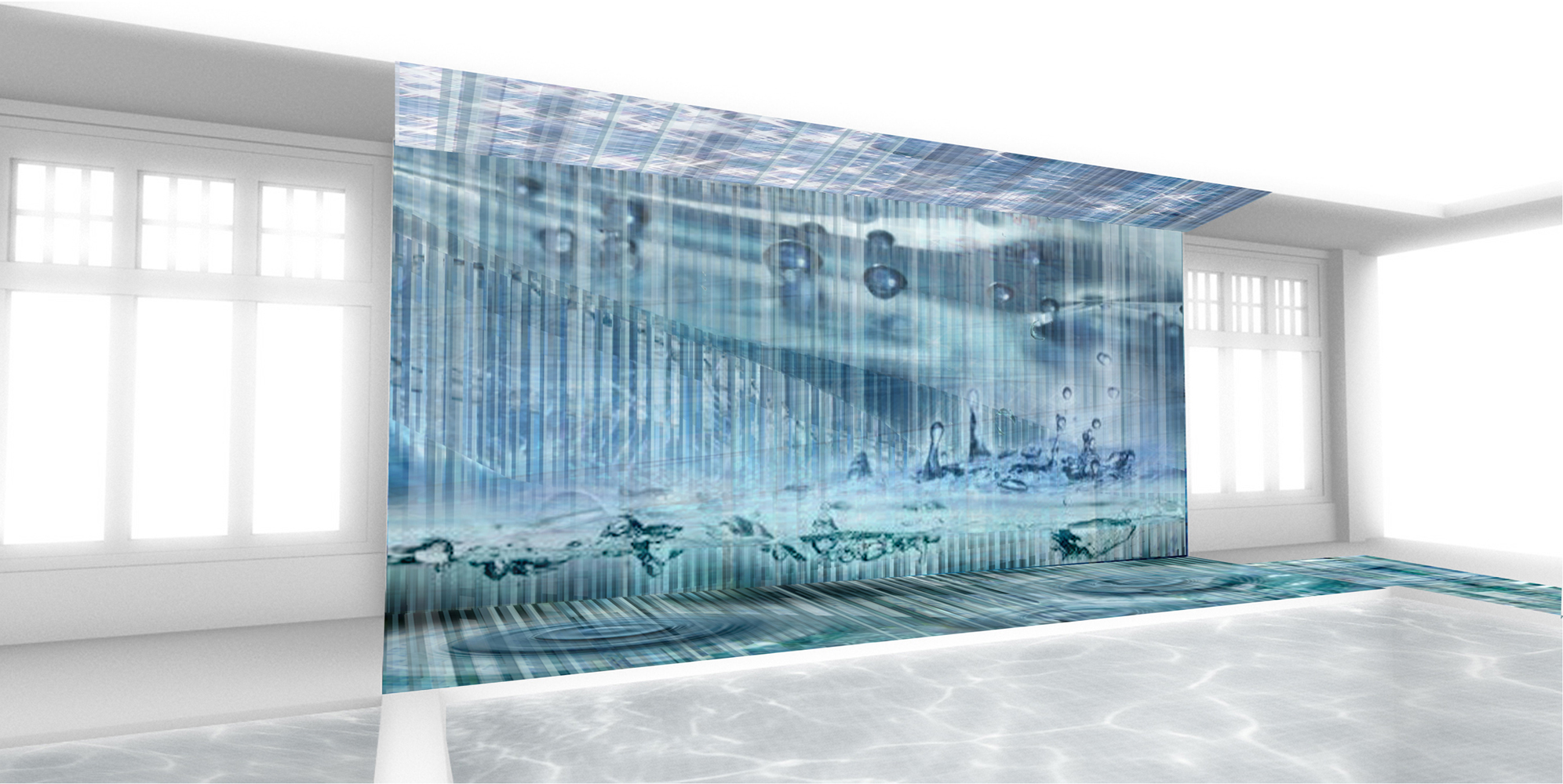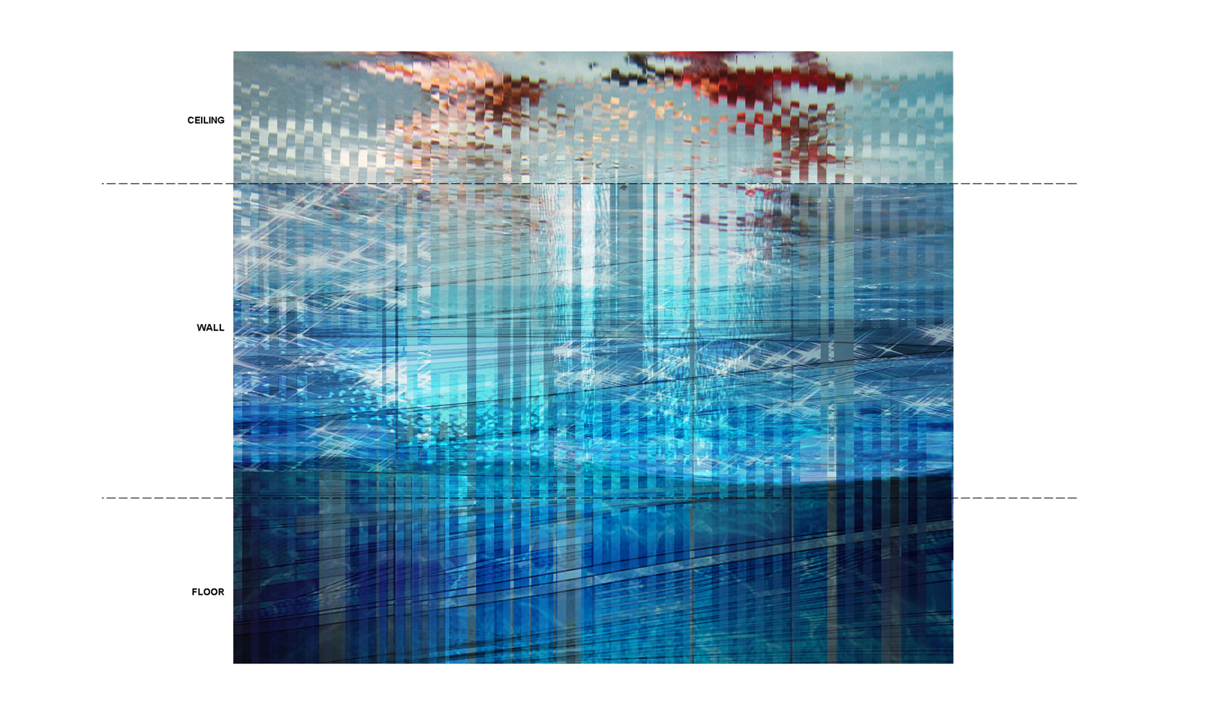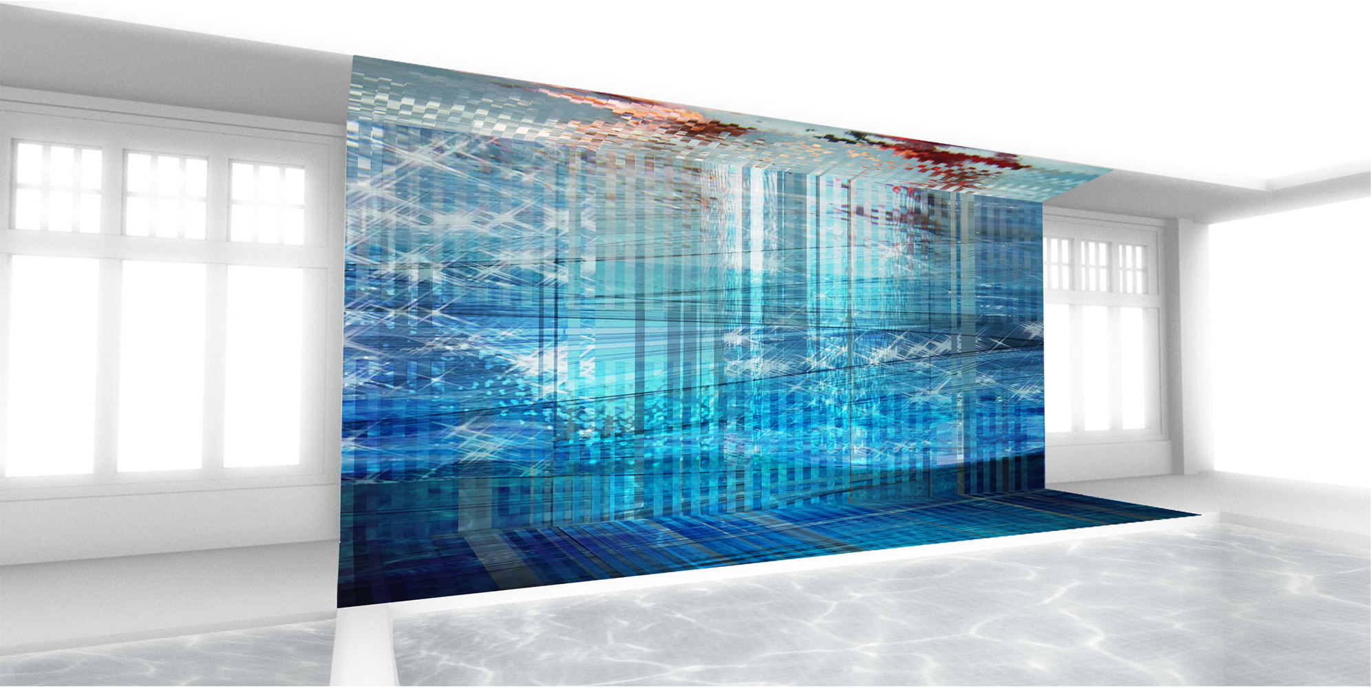 Commissioned for a private residence and produced with thousands of multi-colored 10mm Bisazza glass tiles, the mural emerges from beneath the water of the indoor swimming pool and wraps onto the adjacent floor. It continues up the wall and proceeds to fold onto the ceiling. The experience is one of amplification. Bathers sense a continuation of the reflection and sparkle of the water. The mural surrounds the bather and expresses qualities of refraction and infiniteness, much like the water in the pool. While moving through the space, bathers interact with and are enfolded by the fluidity of both the water and the mural.